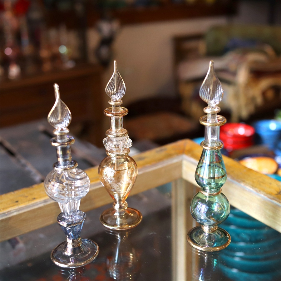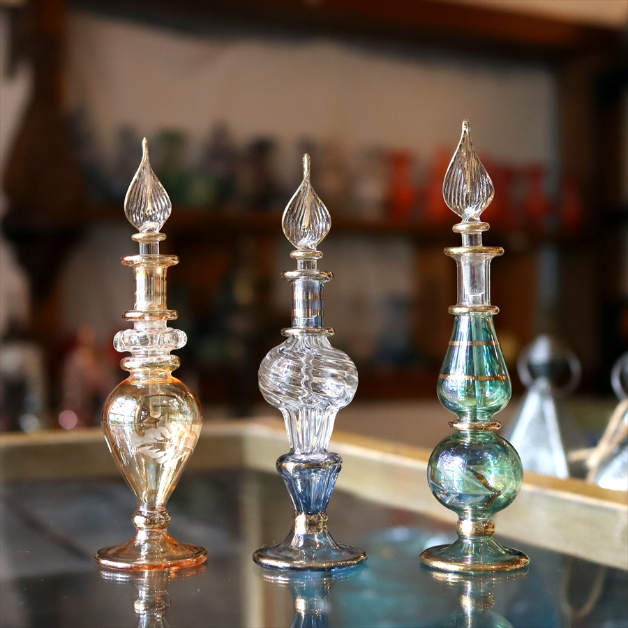 アラビアンな輝きの香水瓶。約12cmの高さのミニサイズ3本セットです。エジプトのカイロにて職人さんが一つ一つ手作りで作っているので、カラーやデザインのバリエーションも様々です。