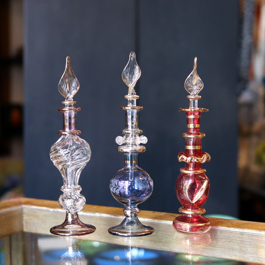 アラビアンな輝きの香水瓶。約12cmの高さのミニサイズ3本セットです。エジプトのカイロにて職人さんが一つ一つ手作りで作っているので、カラーやデザインのバリエーションも様々です。
