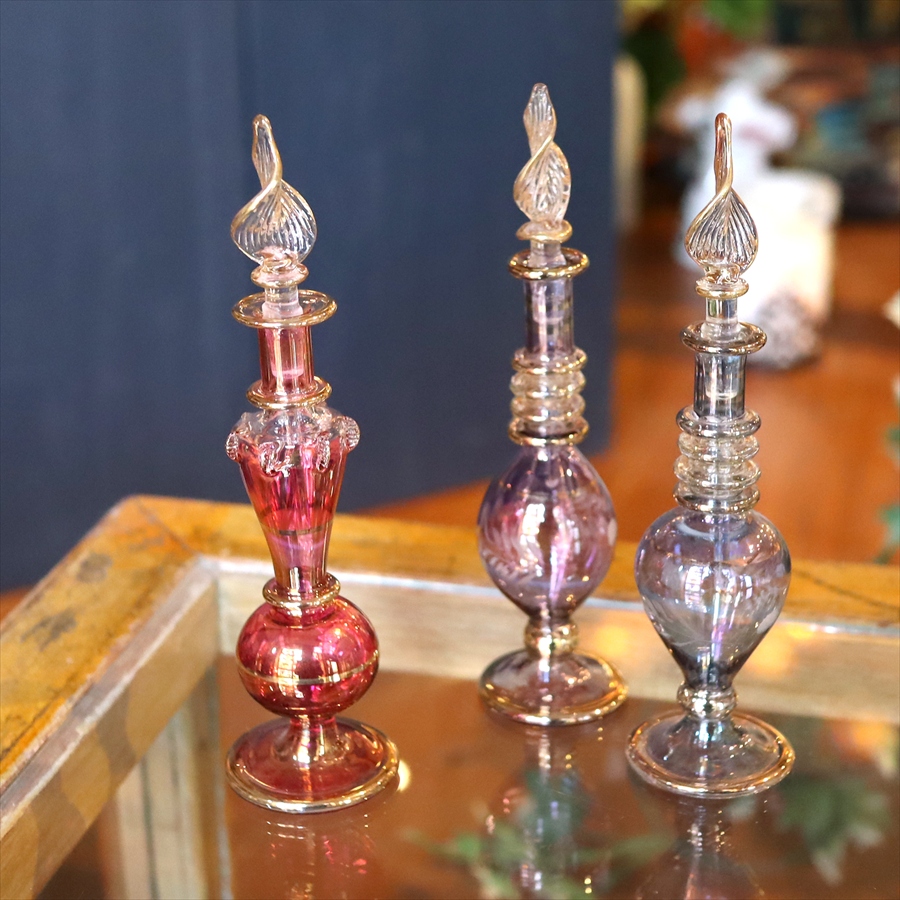 アラビアンな輝きの香水瓶。約12cmの高さのミニサイズ3本セットです。エジプトのカイロにて職人さんが一つ一つ手作りで作っているので、カラーやデザインのバリエーションも様々です。
