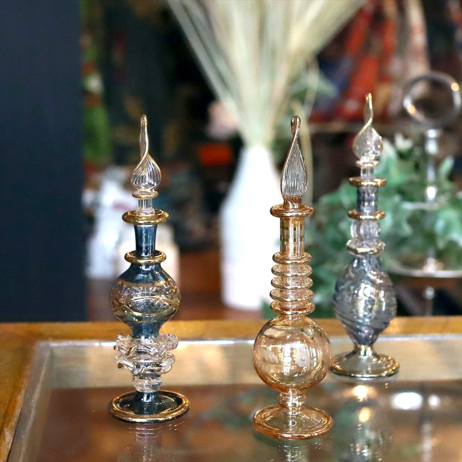 アラビアンな輝きの香水瓶。約12cmの高さのミニサイズ3本セットです。エジプトのカイロにて職人さんが一つ一つ手作りで作っているので、カラーやデザインのバリエーションも様々です。