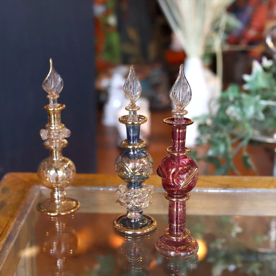 アラビアンな輝きの香水瓶。約12cmの高さのミニサイズ3本セットです。エジプトのカイロにて職人さんが一つ一つ手作りで作っているので、カラーやデザインのバリエーションも様々です。