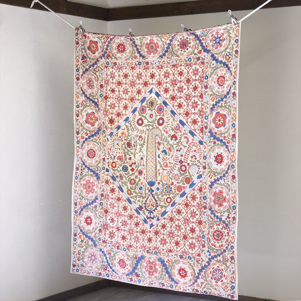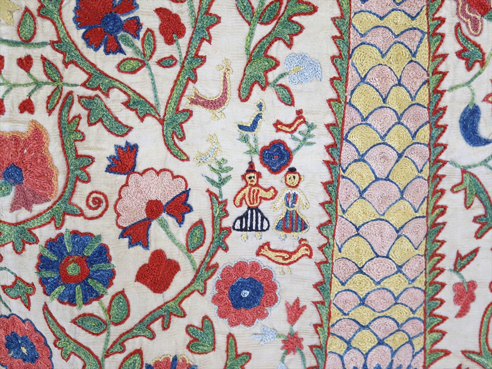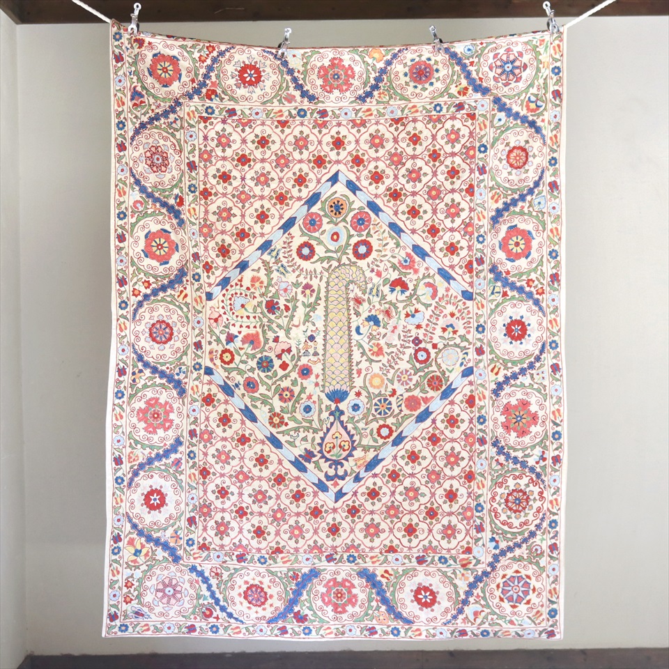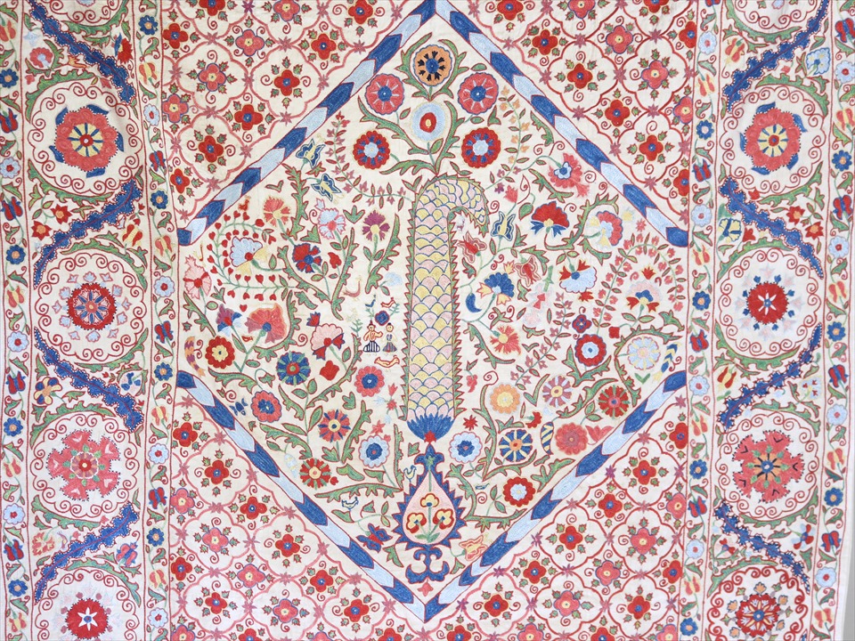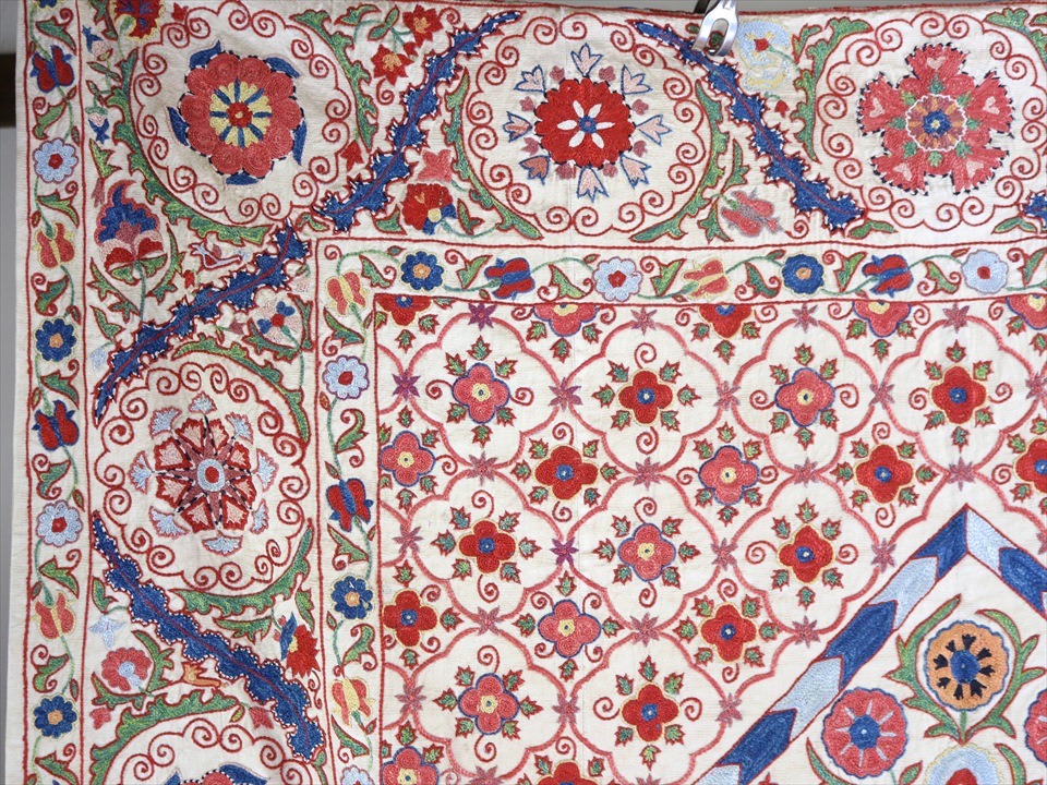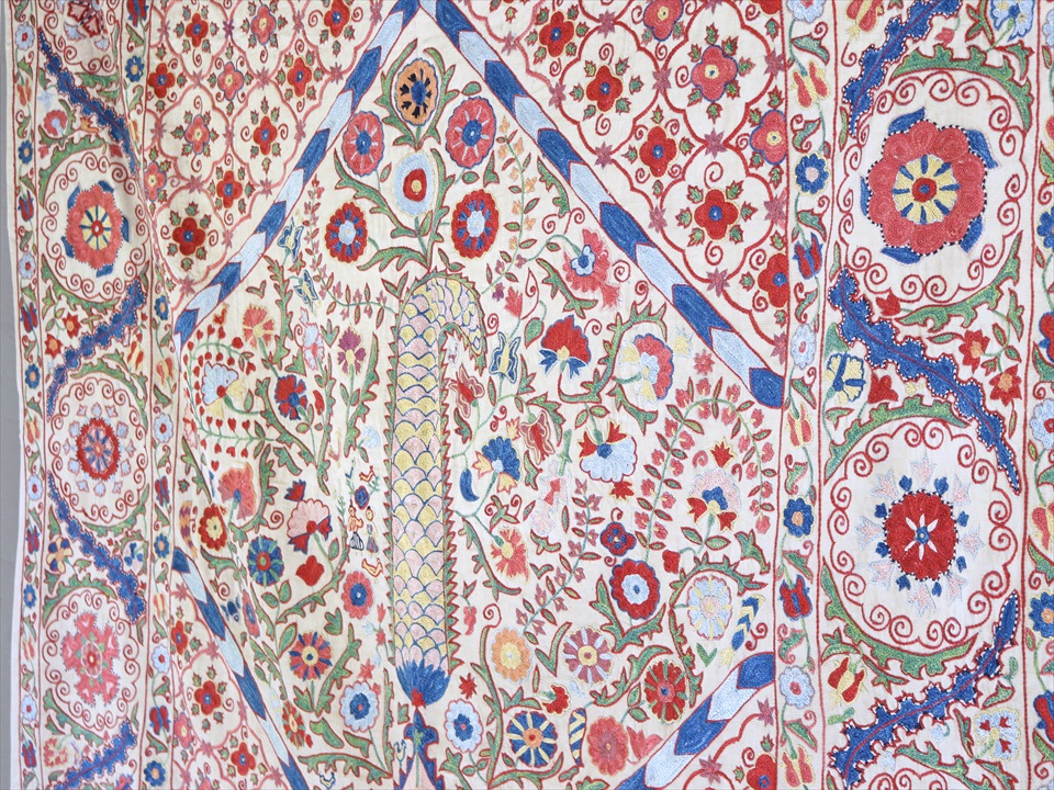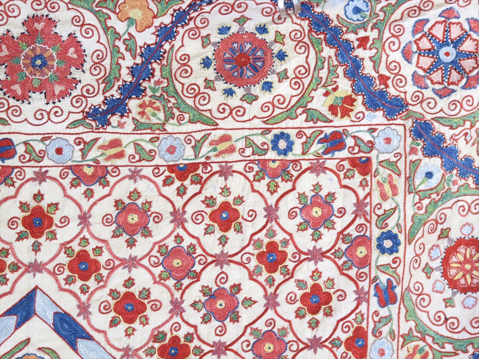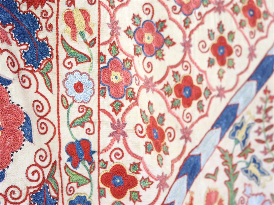 【リプロダクション・スザンニ】中央アジア・ウズベキスタン共和国で作られたシルク糸の手刺繍布「スザンニ」。アンティークリプロダクションは、主に18世紀中ごろから19世紀末にかけて作られたスザンニのデザインを再現したもので、一時は途絶えてしまった伝統が、ソヴィエトから独立した1991年以降に再び取り戻され、現代に受け継がれているものです。