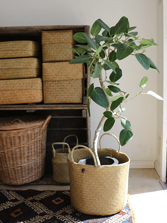 ツヤと弾力のあるカチュー水草を編んだバスケットです。カチューは、バンブー(竹)よりしなやかでやわらかく、パンダン(い草)よりコシが強くしっかりしている質感です。表面に塗料も塗っていない天然素材のみのバスケットです。