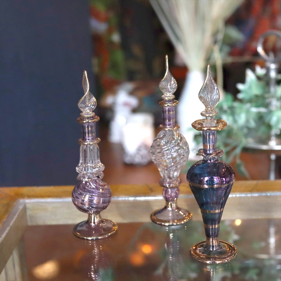 アラビアンな輝きの香水瓶。約12cmの高さのミニサイズ3本セットです。エジプトのカイロにて職人さんが一つ一つ手作りで作っているので、カラーやデザインのバリエーションも様々です。