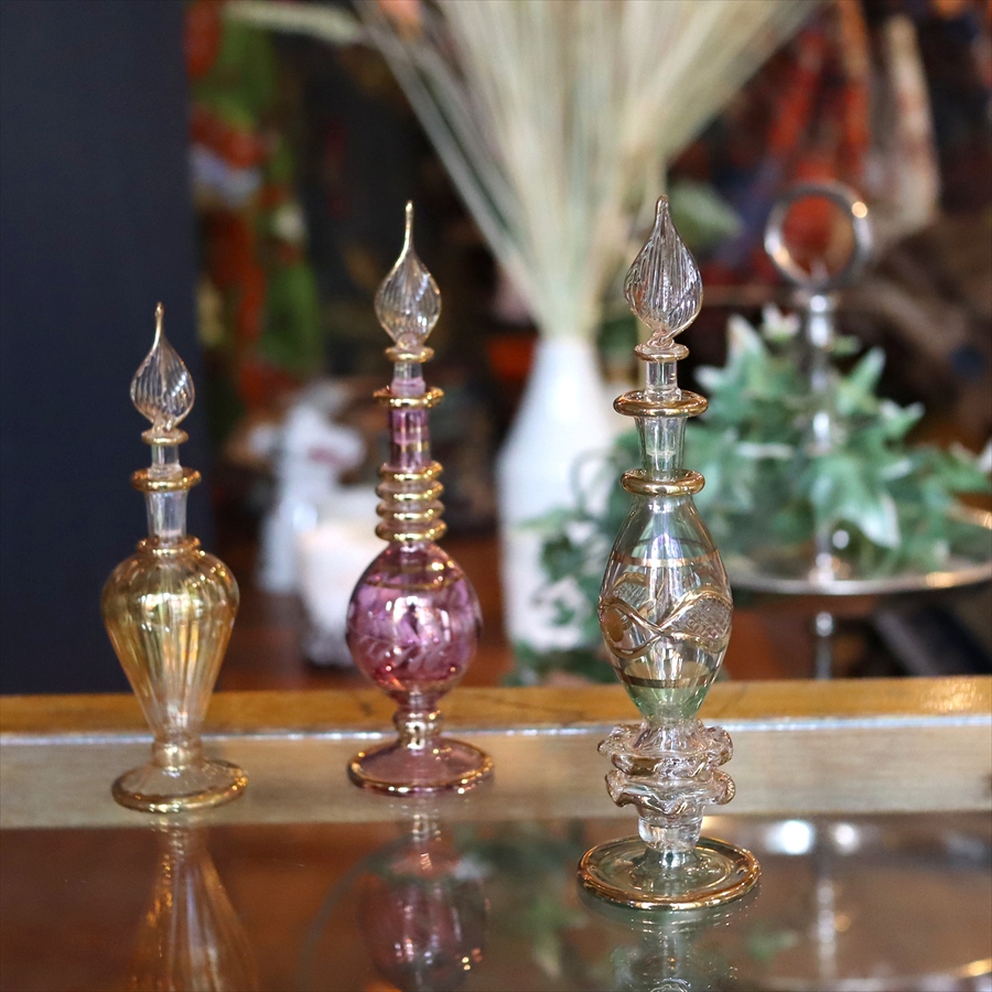 アラビアンな輝きの香水瓶。約12cmの高さのミニサイズ3本セットです。エジプトのカイロにて職人さんが一つ一つ手作りで作っているので、カラーやデザインのバリエーションも様々です。