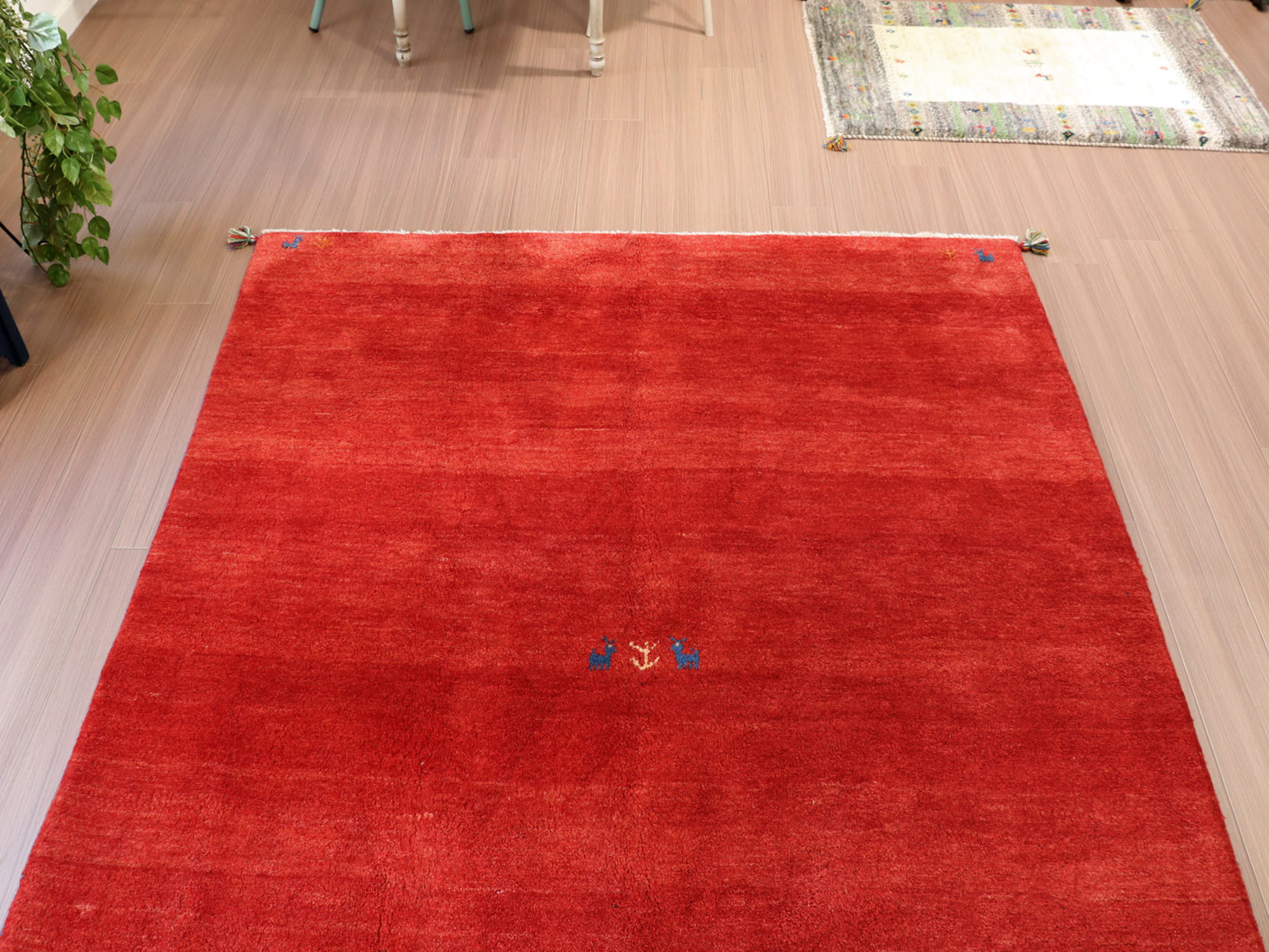 鮮やかな赤が映えるシンプルなギャッベ。赤の色がすっきり明るく見えるのは、グレーやこげ茶などがほとんど混ざっていないためです。わずかに染めムラによる濃淡が出ていてます。