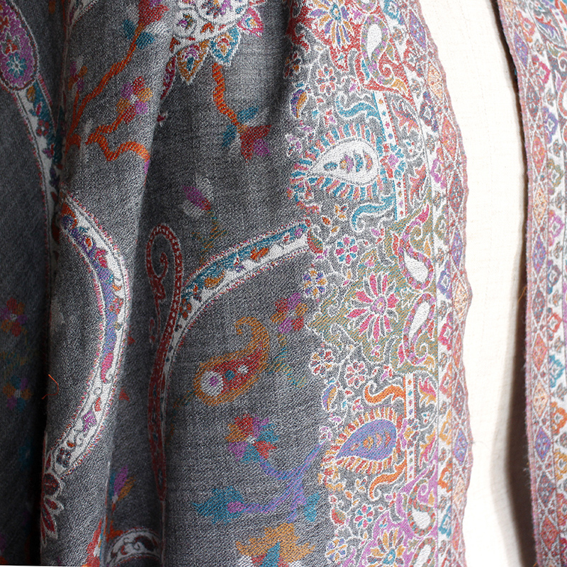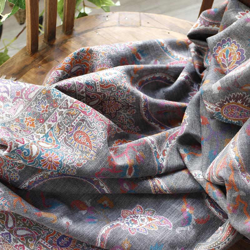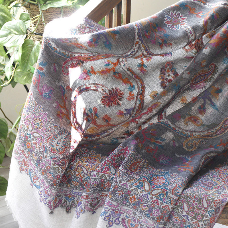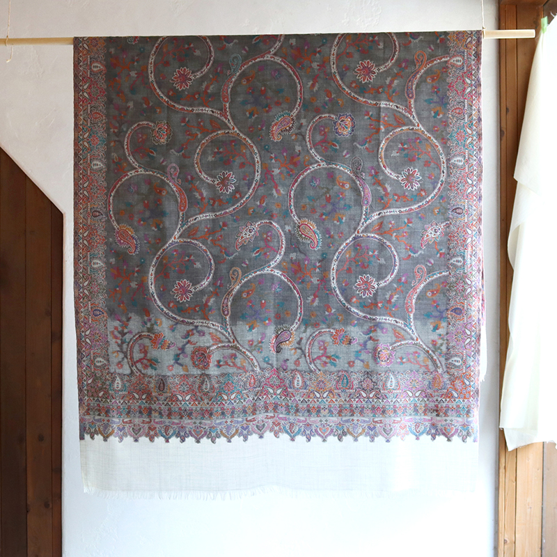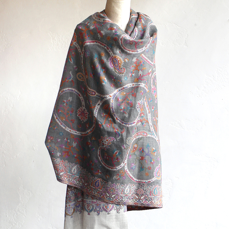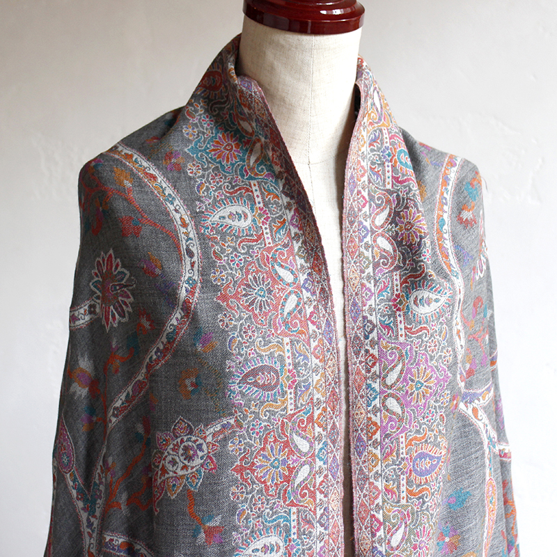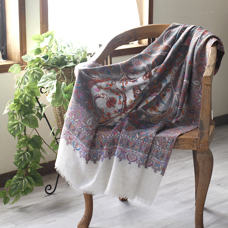 ウールのストール・/大判サイズグレー・ペイズリーと花のモチーフ