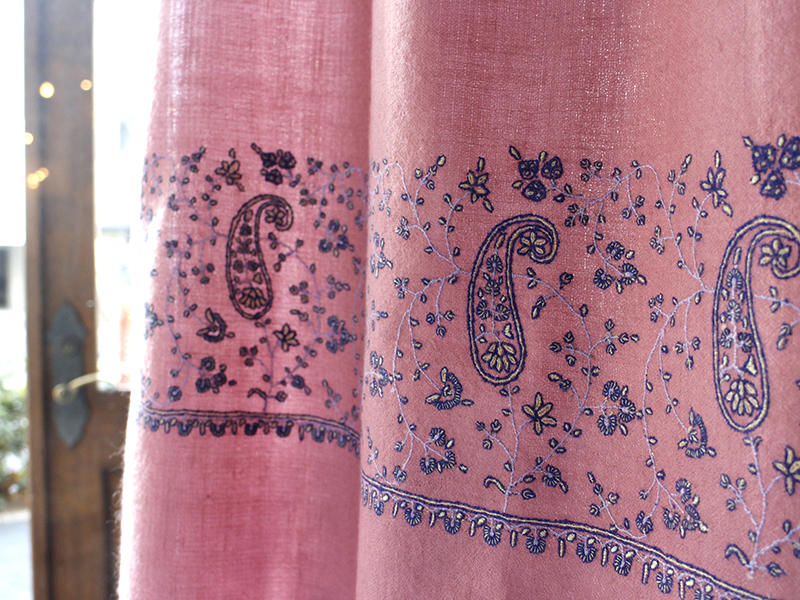 手織りのカシミアストール/細かな刺繍・大判サイズピンク/ペイズリーとつる草と花