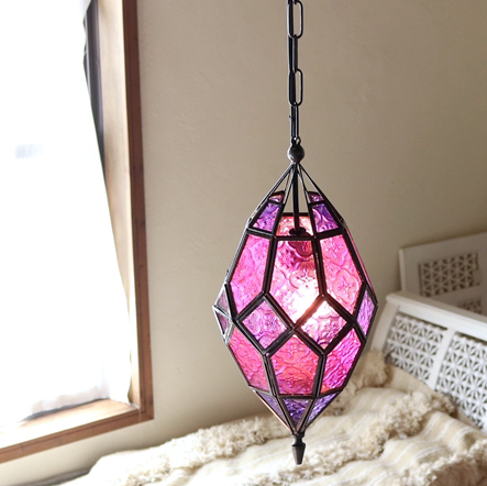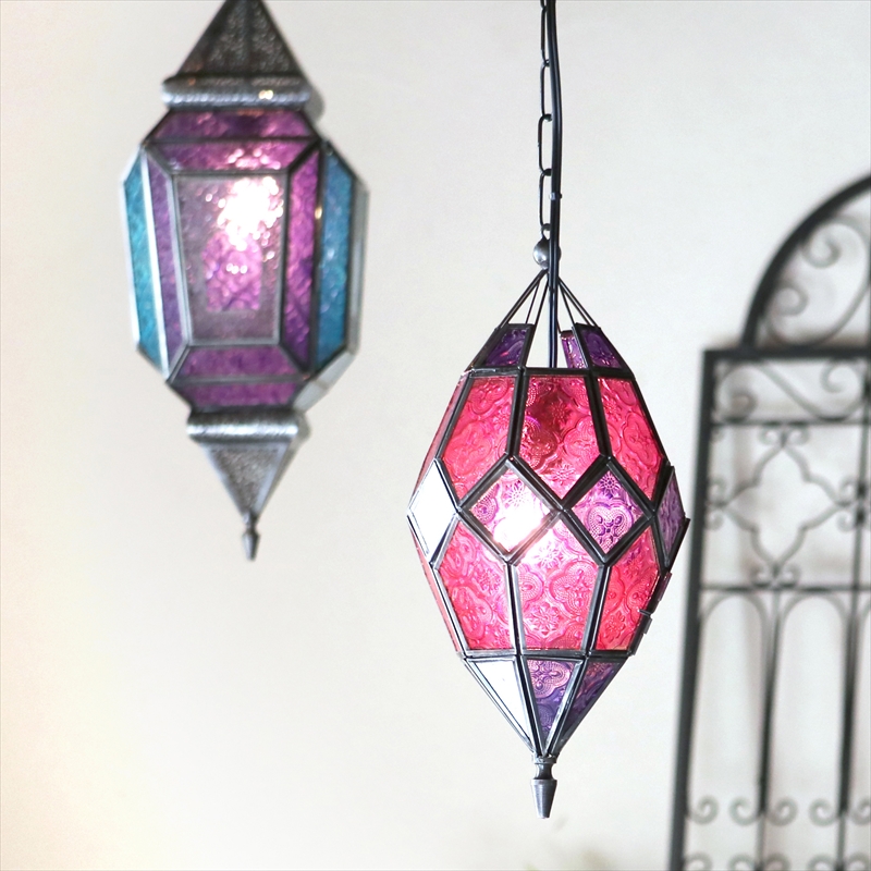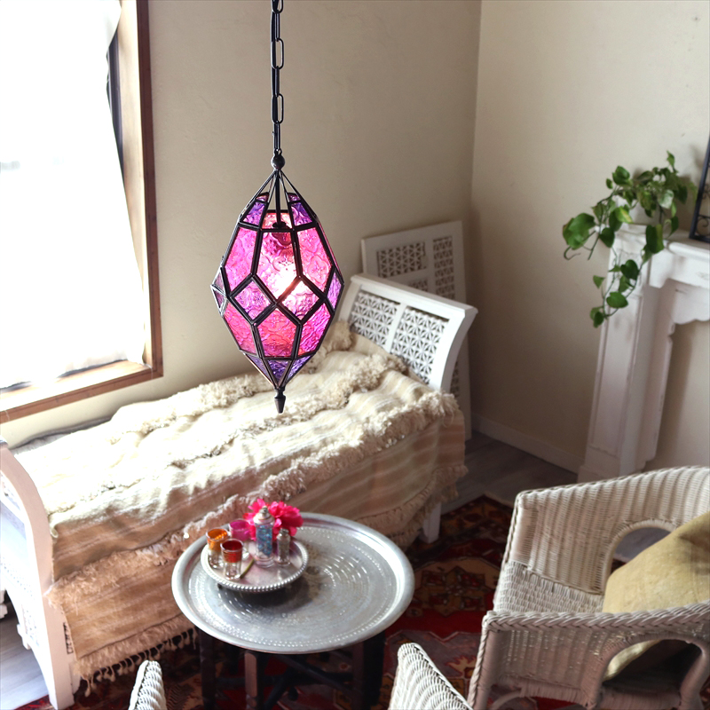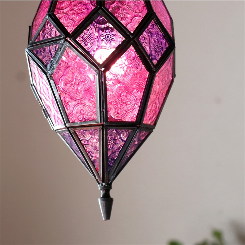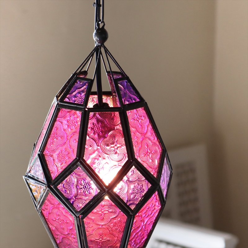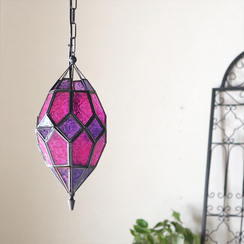 - 【10%OFF】モロッコランプ・ガラスペンダントライト/キャンドルホルダー 多面体形ランプ フューシャピンク 直径15cm 全長64cm多面体のレリーフガラス Morocco Lantern Candle holder