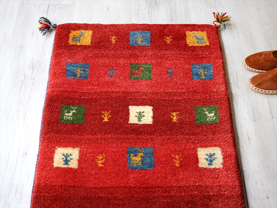 ギャッベ 手織りラグ イラン製 ウール100% 玄関マットサイズ85×60cm レッド ボーダーストライプ 動物と植物モチーフ