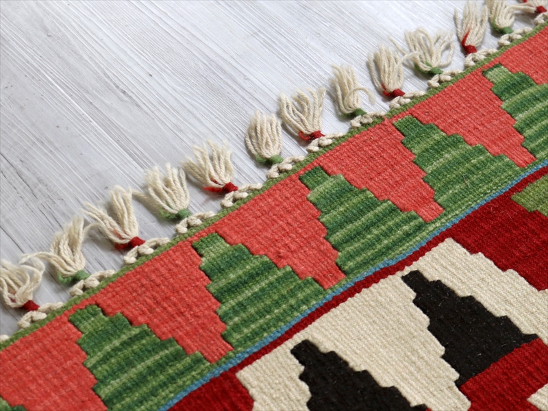 織り地は、やわらかくしなやか。厚みは、キリムとしては標準的でおよそ5mm弱の薄手の平織りの敷物です。色の切替部分は、キリムの織りの特徴で、縦に隙間が開いています(スリットと呼んでいます)。
