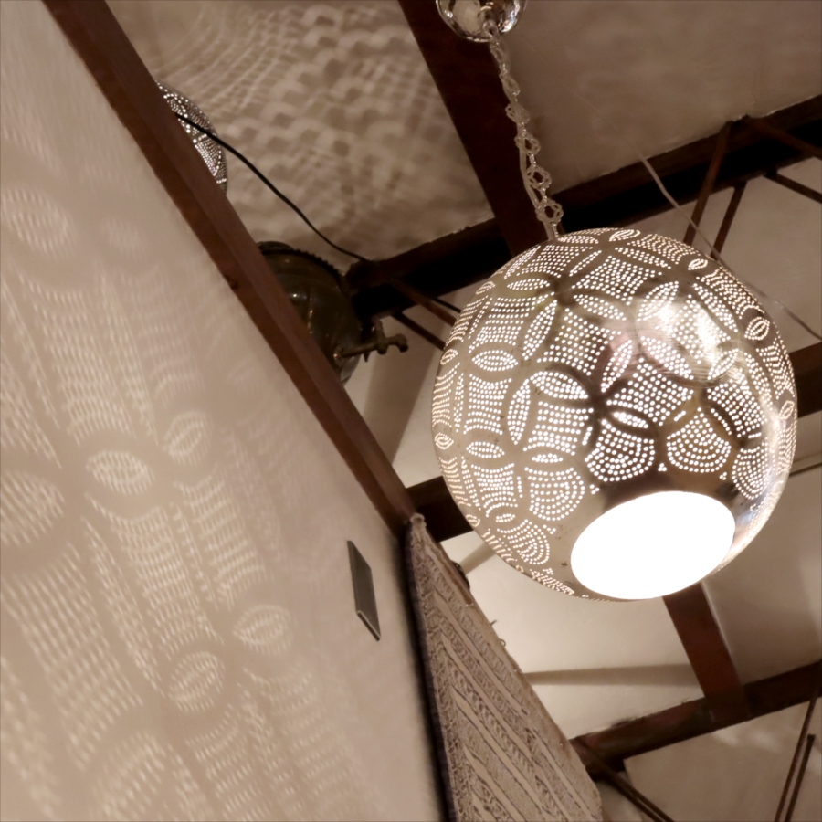 エジプトで、17世紀から作られてきた伝統的な技法で作られています。デザインはモダンにアレンジされていて、細かな孔からこぼれる光が壁に移り、エキゾチックな雰囲気を演出します。