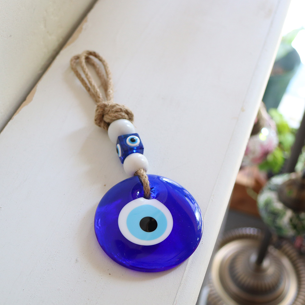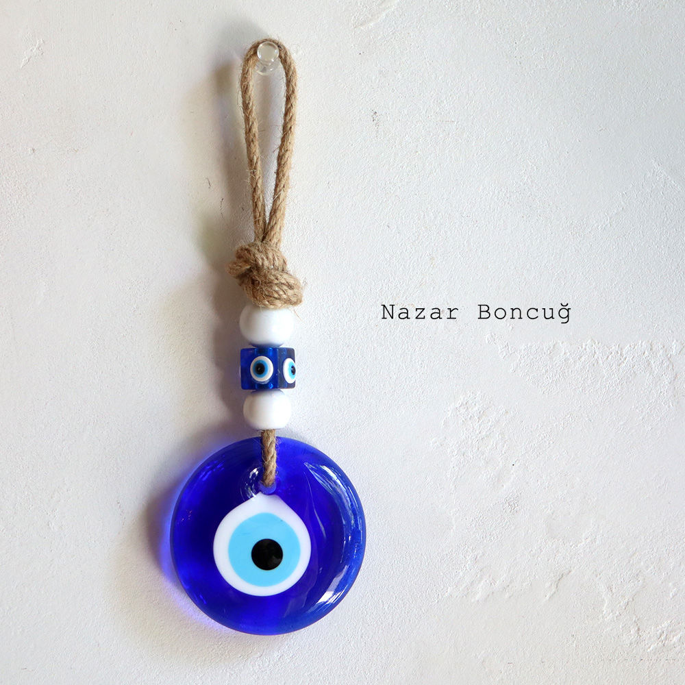 直径約7.5~8cmのナザールボンジュウに、しっかりとした麻ひもを合わせたシンプルなデザインです。