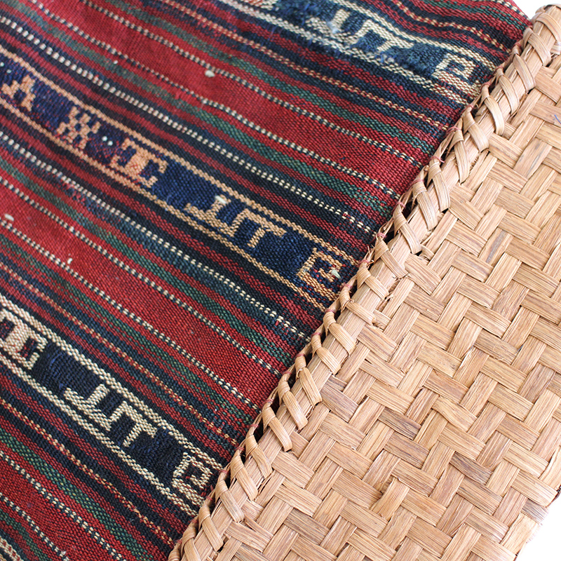 イラン北部のテント飾りに使われていたガジャリキリムと、山ぶどうのかごでオリジナルのバッグを作りました。かごはシンプルな網代編みで角型・長方形のすっきりとした形です。持ち手は巻き仕上げで、本体とのつなぎには柔らかい革を使いました。座って膝にのせた時など、持ち手がおれてじゃまにならず使いやすいです。内布は無地の紺色です。ICカードやスマフォが入る大きさの内ポケットがひとつ付いています。