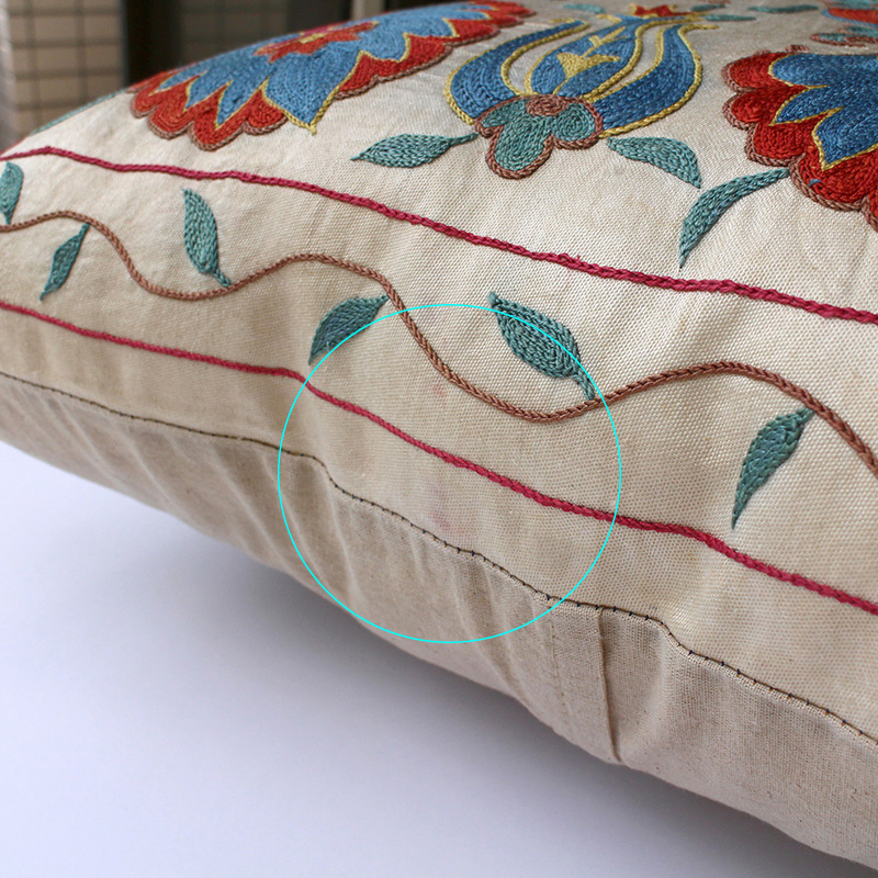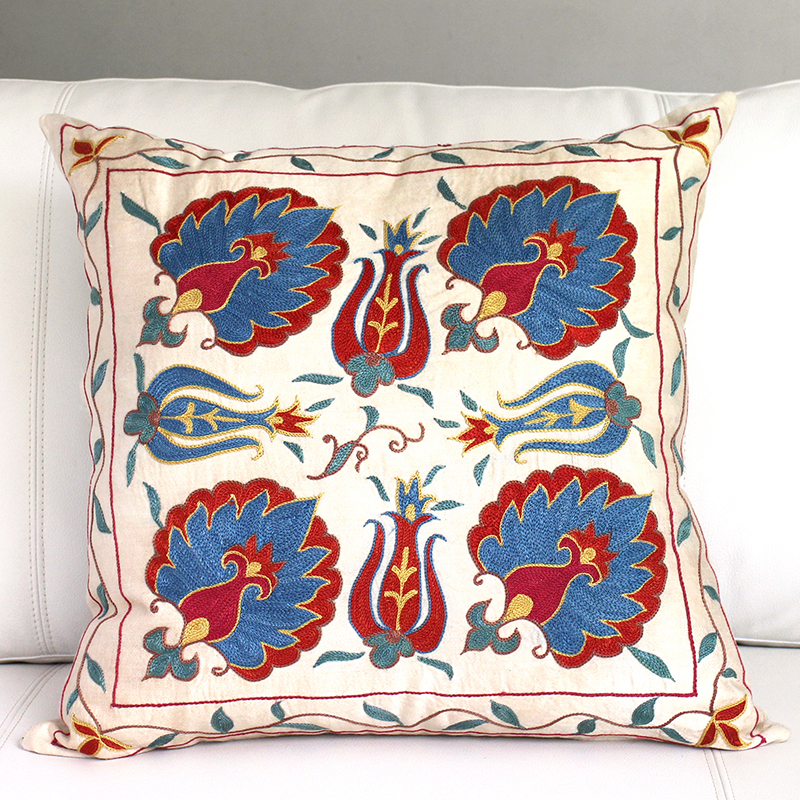 ウズベキスタンの伝統の手刺繍布・スザンニをクッションカバーに仕立てました。緻密なニードルワークによるチェーンステッチの手刺繍が見事です。