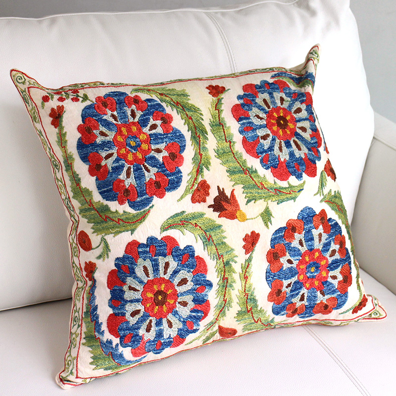 ウズベキスタンの伝統の手刺繍布・スザンニをクッションカバーに仕立てました。緻密なニードルワークによるチェーンステッチの手刺繍が見事です。