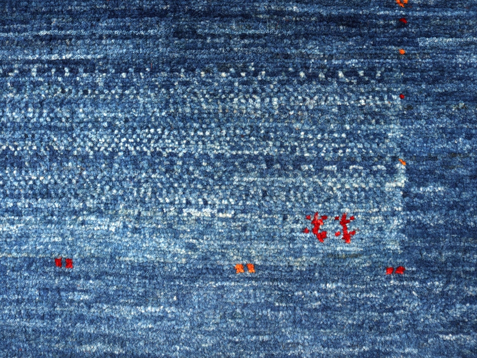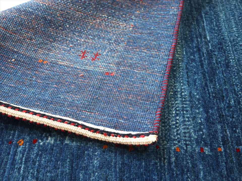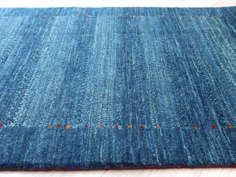 比較的明るめのブルーの濃淡の色の毛糸を使用して、内側はボーダー、外側は枠縁を織ったシンプルで上品デザイン。控えめにはいったドットや小さなモチーフは細かい織りでこそ可能なデザイン。パイル(毛足)の目の方向により、色濃く重厚に見えたり、色鮮やかで明るく見えたりと印象が異なるのも、織り目の細かな最上級のギャベです。
