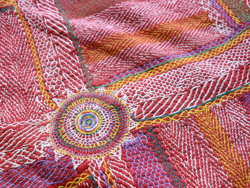 コットン布を重ねて縫い合わせた刺し子刺繍の布は、一般の家庭で使うために作られたものなので、整っていない部分もあり、温かみのある手作りの雰囲気が感じられます。