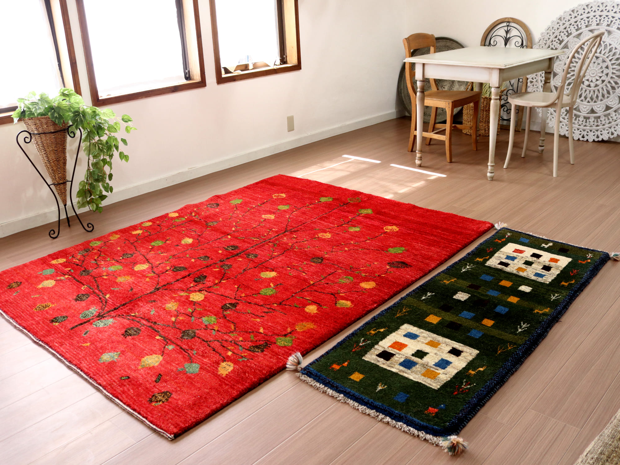 西洋アカネの根などで染めたレッドの地にギャッベいっぱいに大胆に織られたザクロの樹が立派な1枚。枝が上下に伸び、たくさんの実や葉をつけた様子が織りで表現されています。ベースの赤の色は、発色がよく明るい赤で、染めムラによる濃淡が自然な感じに出ています。