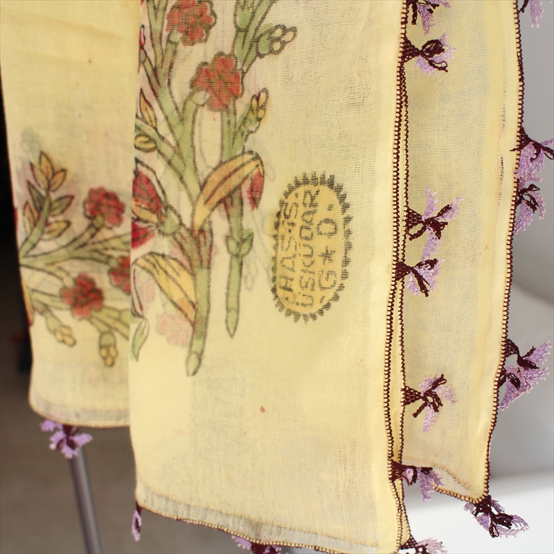 イエローに赤いお花がプリントされ、薄いパープルのオヤが細めの糸で編まれたスカーフです。