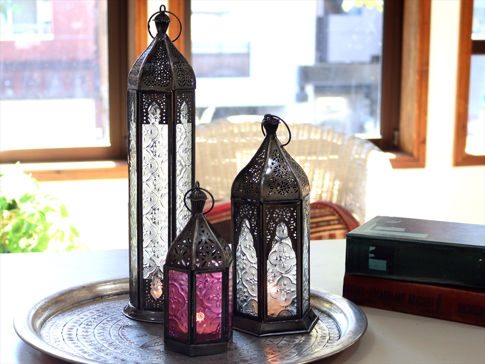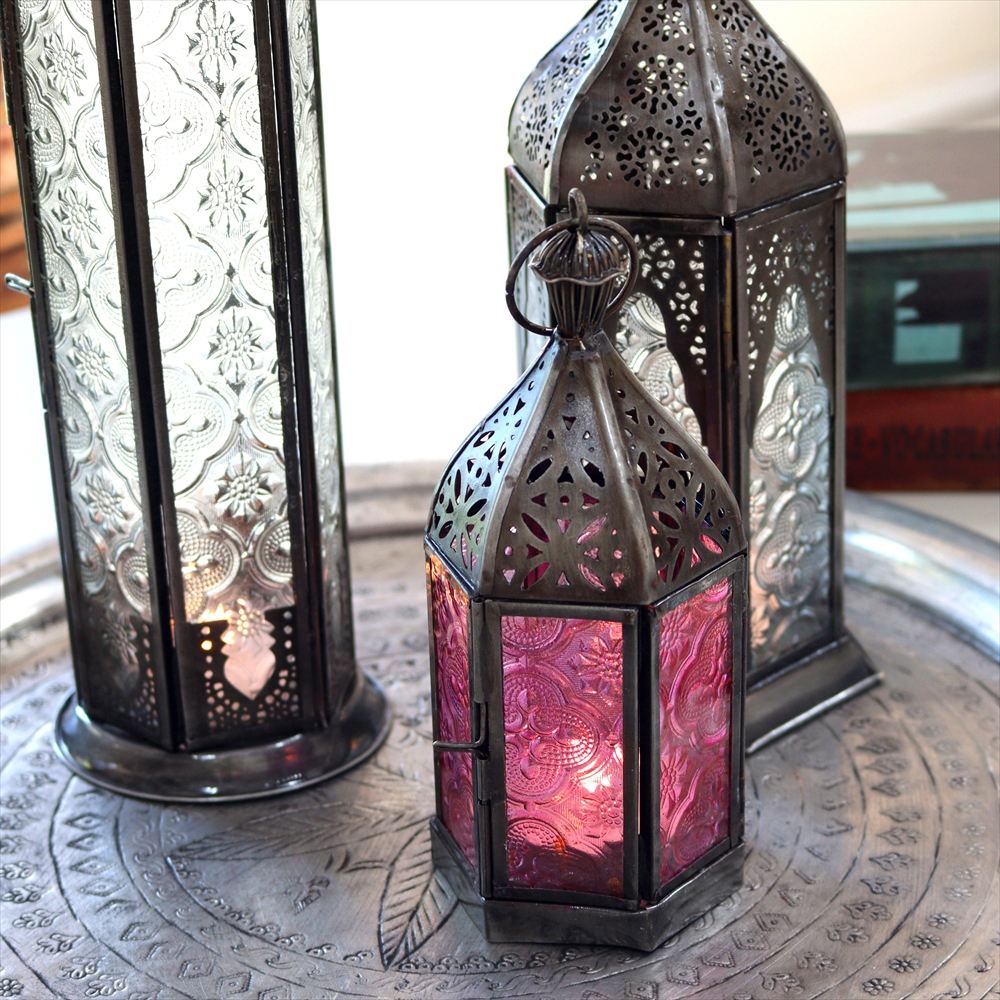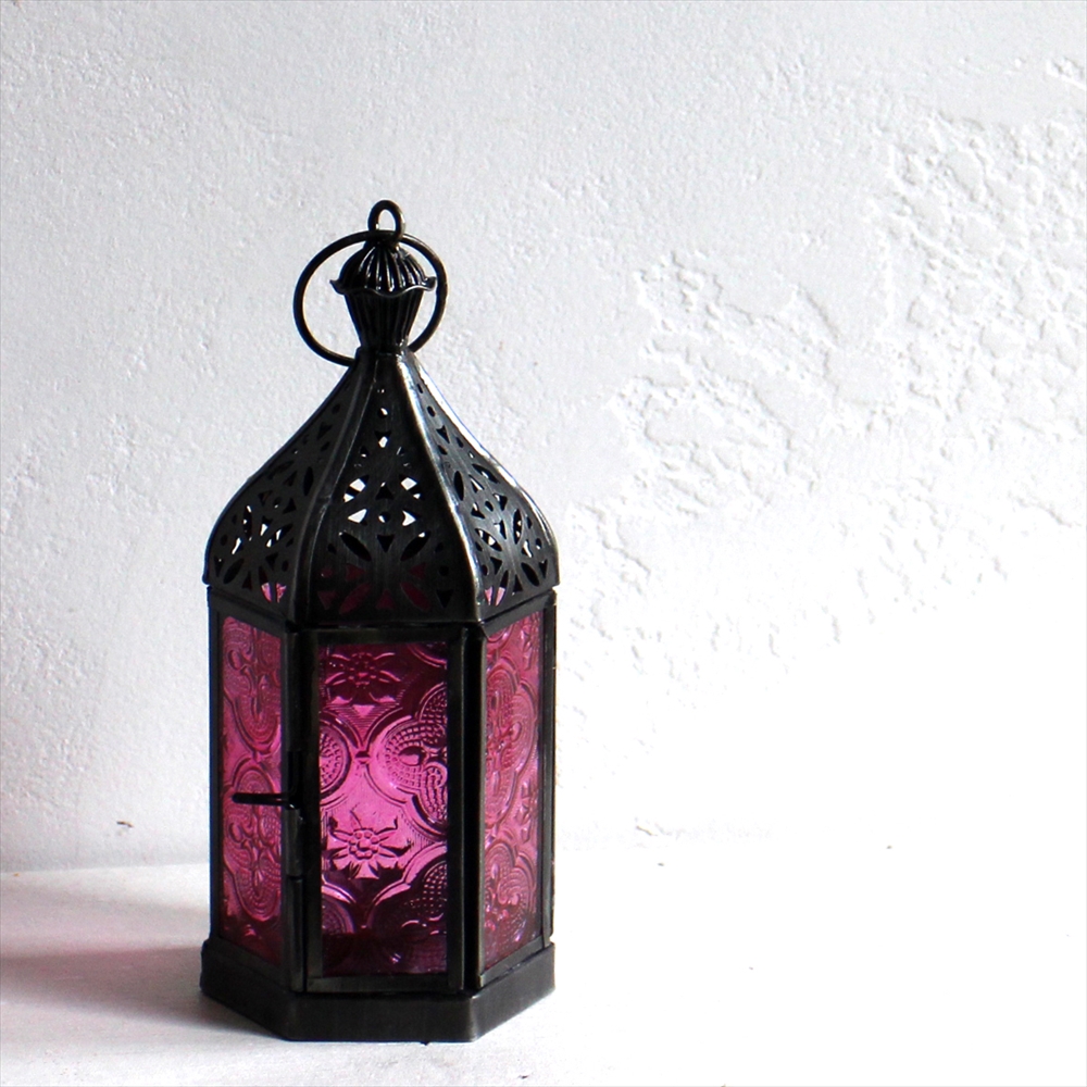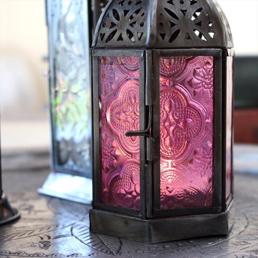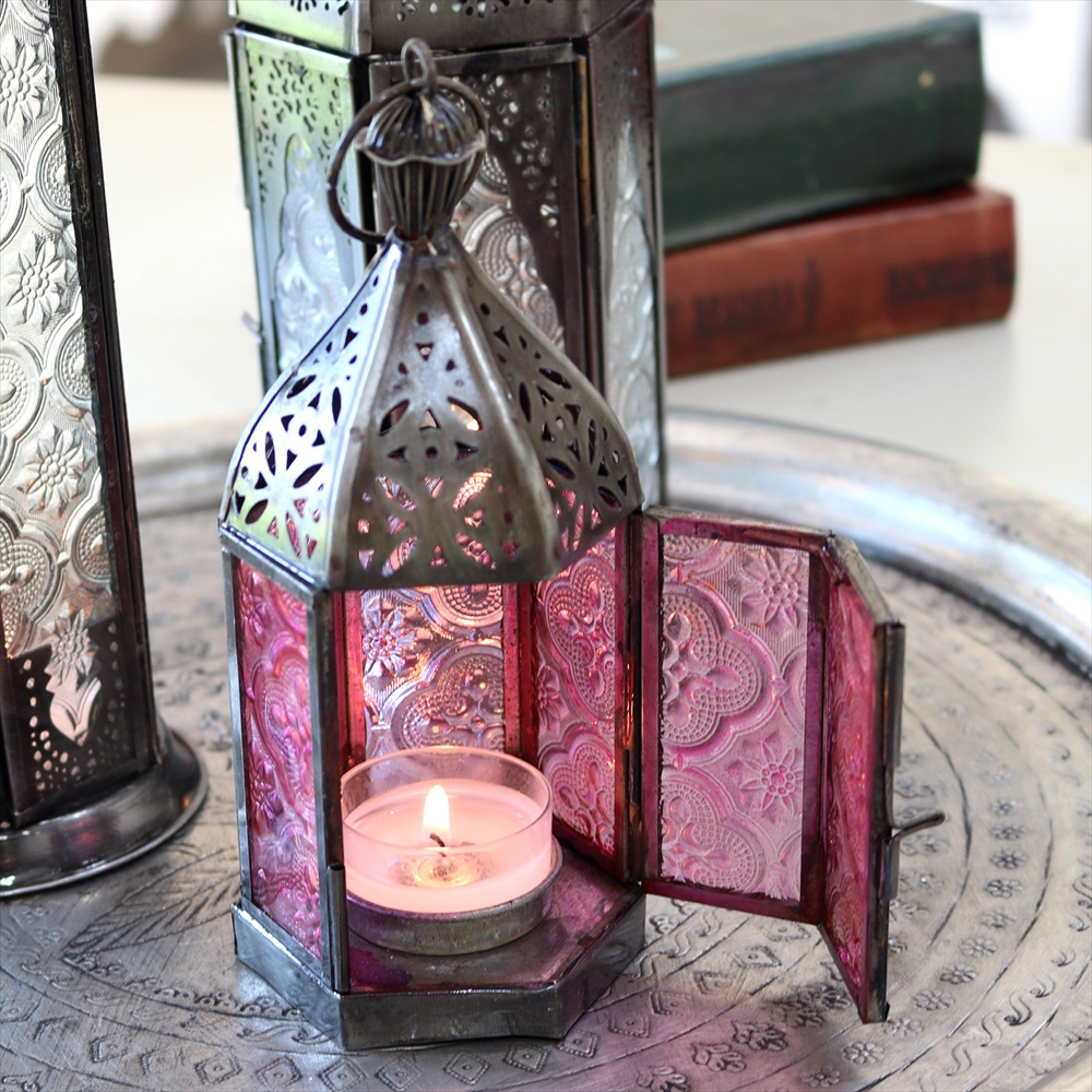 6面のレリーフガラスがはられた小ぶりなランタン。ビビットなピンクはモノトーンの家具や空間と相性がよくお部屋のアクセントになってくれそうです。異なる高さのランタンと一緒にテーブルの上に並べるだけで素敵でモロッカンスタイルなお部屋になります。