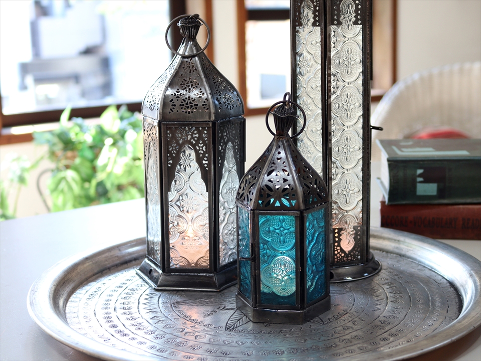 6面のレリーフガラスがはられた小ぶりなランタン。南国の海を思わせるような透き通ったターコイズブルーは白基調のお部屋や茶系の家具と相性がよさそうです。異なる高さのランタンと一緒にテーブルの上に並べるだけで素敵でモロッカンスタイルなお部屋になります。