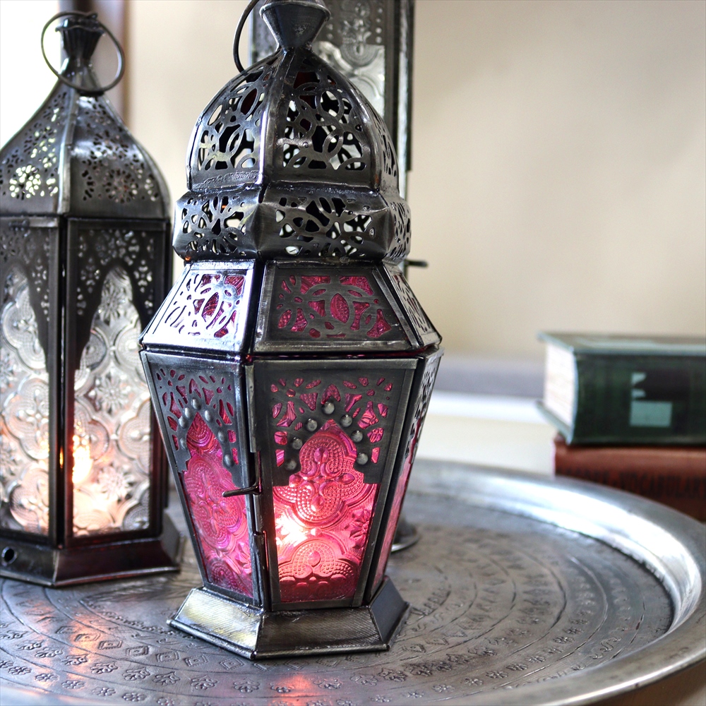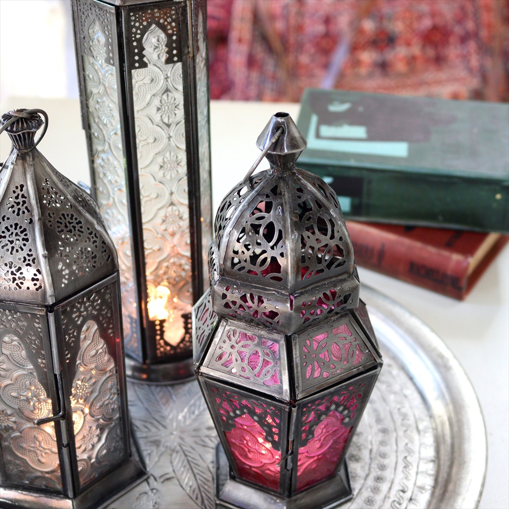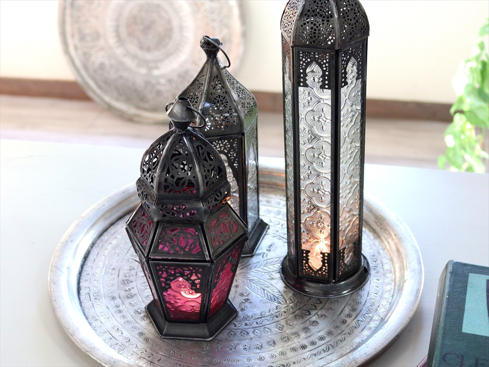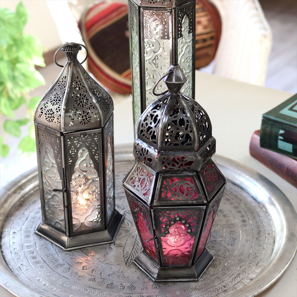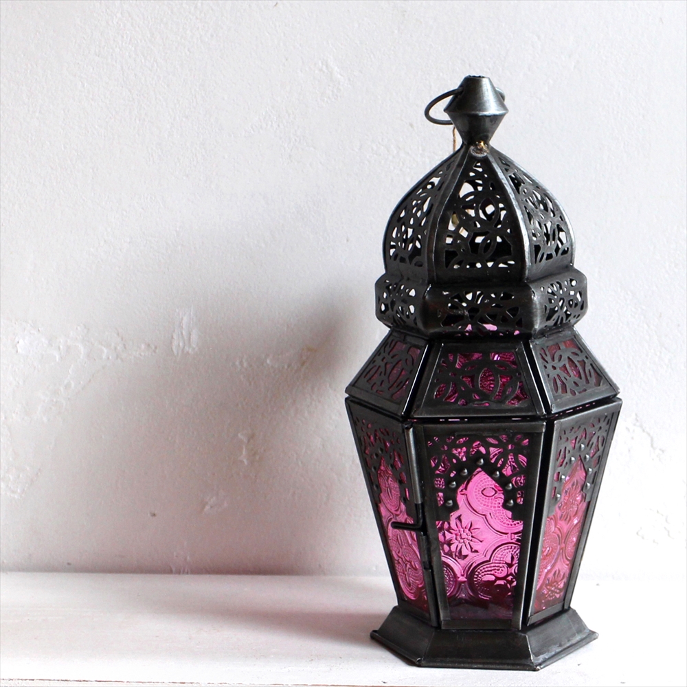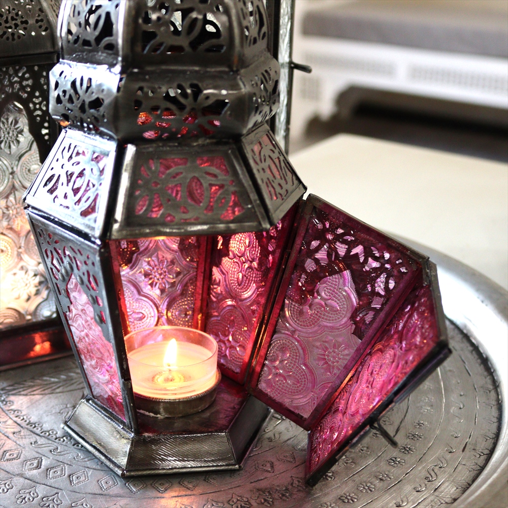 6面のレリーフガラスがはられたランタン。どこかアラビアンで優雅な雰囲気を感じさせてくれるデザインです。ビビットなピンクはモノトーンの家具や空間と相性がよくお部屋のアクセントになってくれそうです。異なる高さのランタンと一緒にテーブルの上に並べるだけで素敵でモロッカンスタイルなお部屋になります。