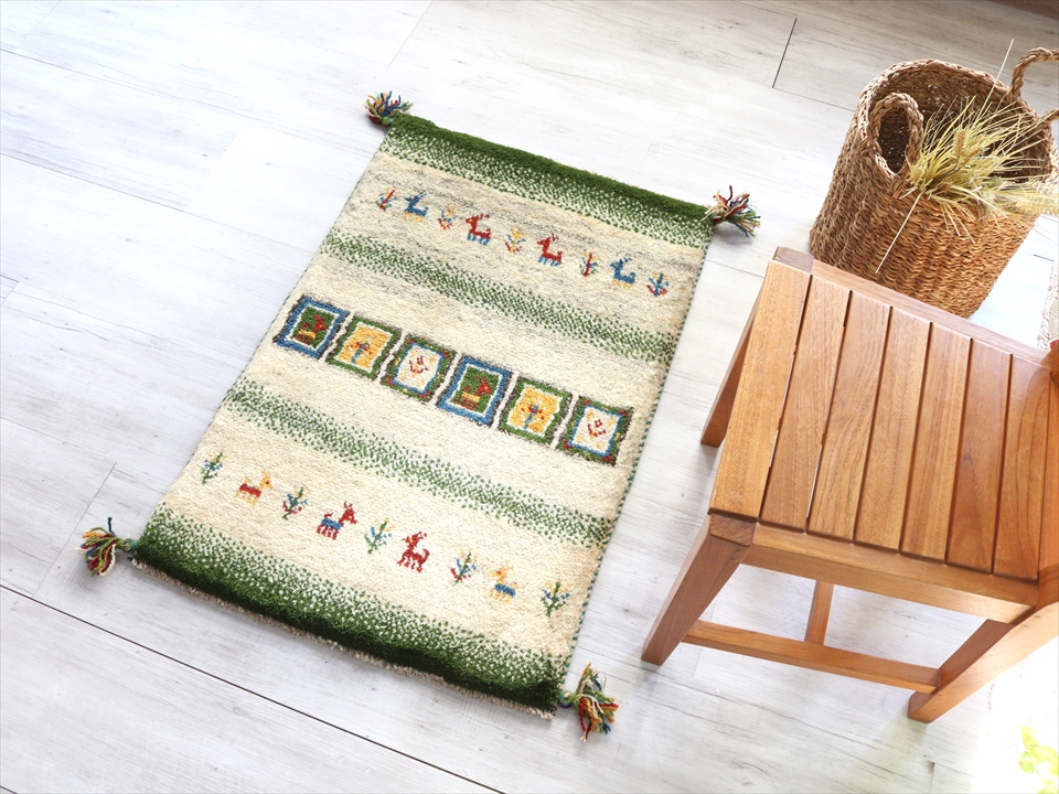 ギャベ 玄関マット イラン製手織りラグ92×60cm ナチュラルアイボリー&グリーン カラフルタイル 動物と植物モチーフ