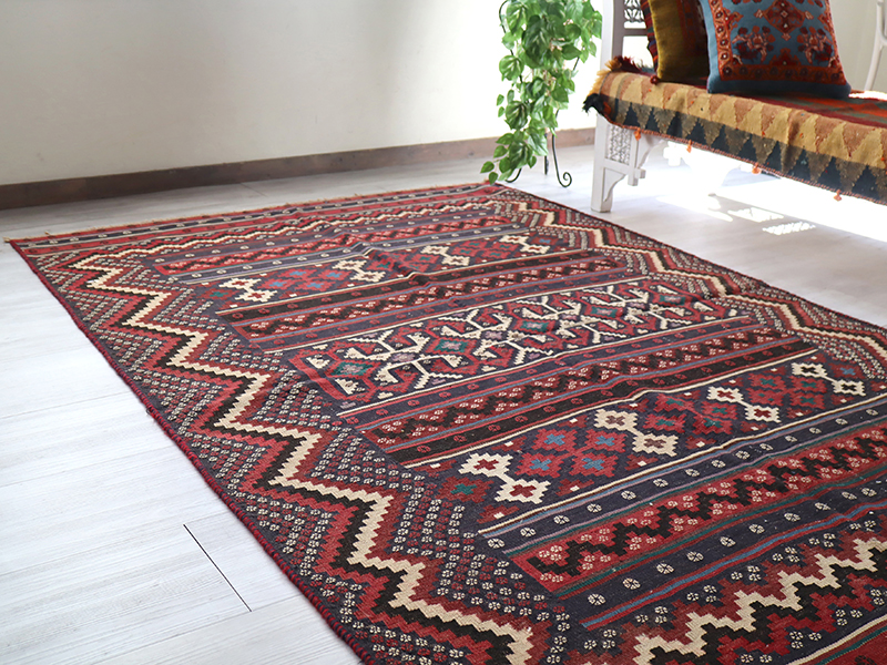 イラン南部のキリムでスザンニ織りと呼ばれる技法で織られています。中央部分は幾何学模様、ボーダーには小さな花のようなモチーフが置かれています。このモチーフ部分は表裏両面に糸が入っているのでぽってりとした厚みがあります。ジグザグした幾何学模様の色の切り替えはスリット織りでつくられることが多いですけれども、このキリムは隙間のない織り方でつくられています。