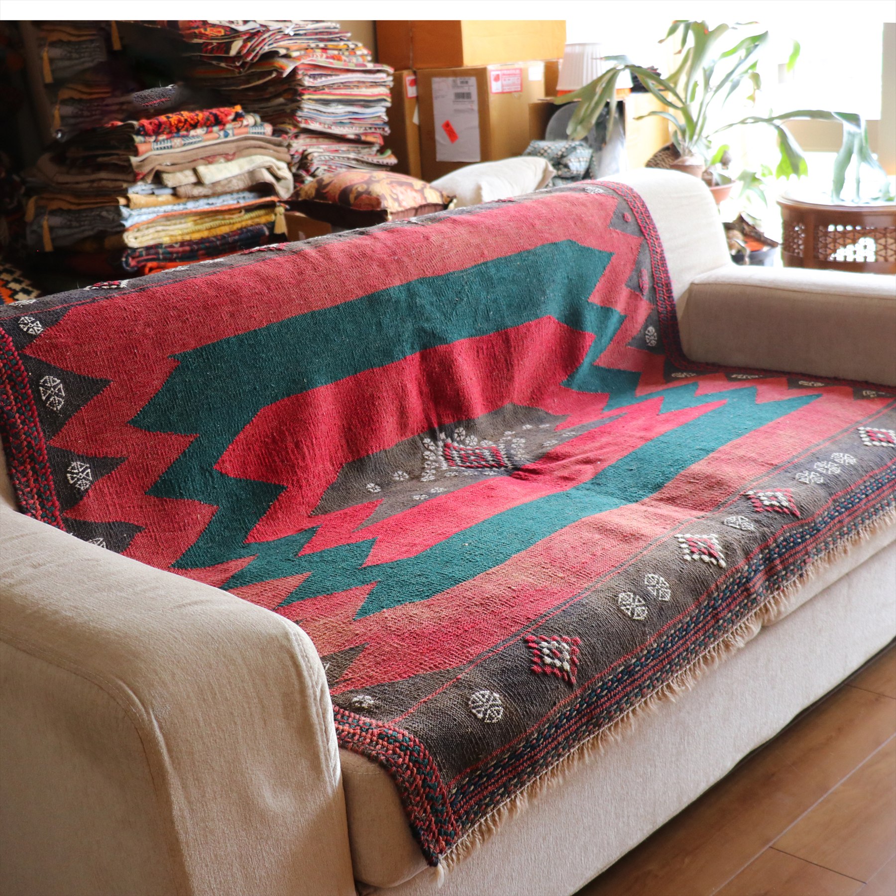 ソフラ(ソフレ)と呼ばれています。このキリムを家族で囲んで、テーブルのように使っていたのものです。食事が終わると、パンを包んでそのまま保管しておくこともあり、まさに遊牧民の生活道具なのです。