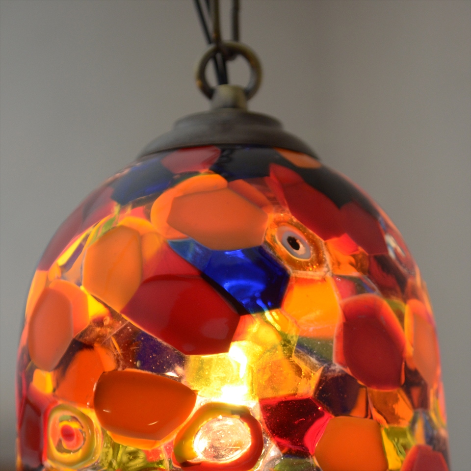 オレンジ、赤、黄色、青色の色ガラスを組み合わせたカラフルな、ベネチアンガラスのランプシェードです。