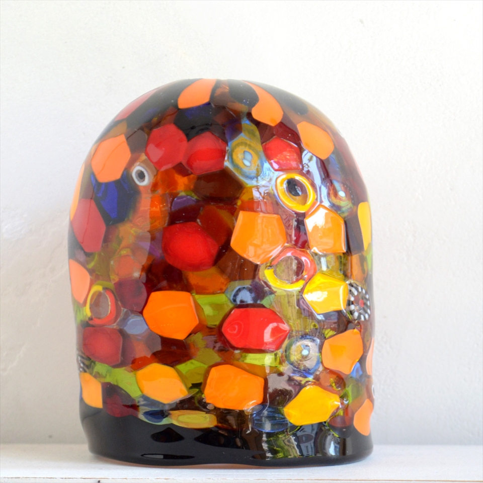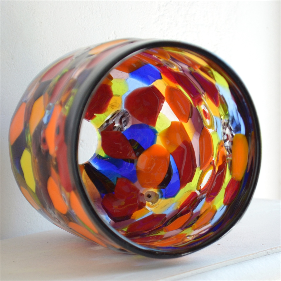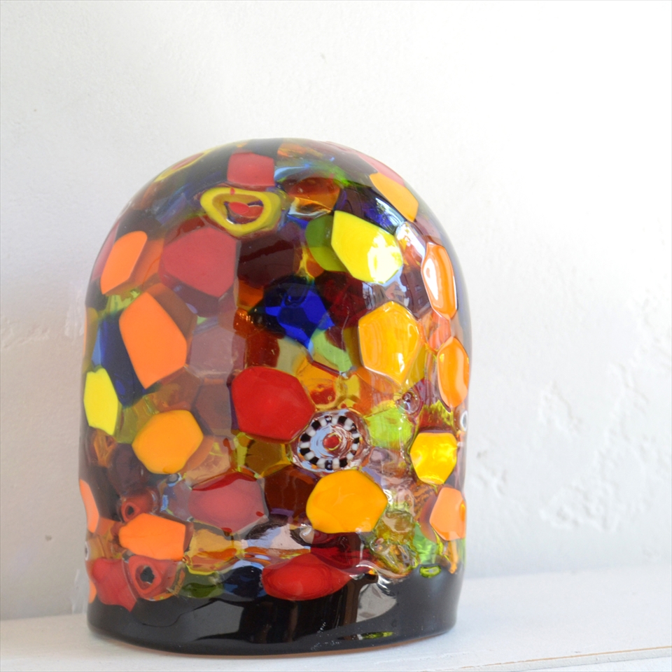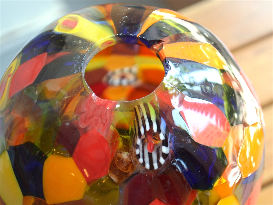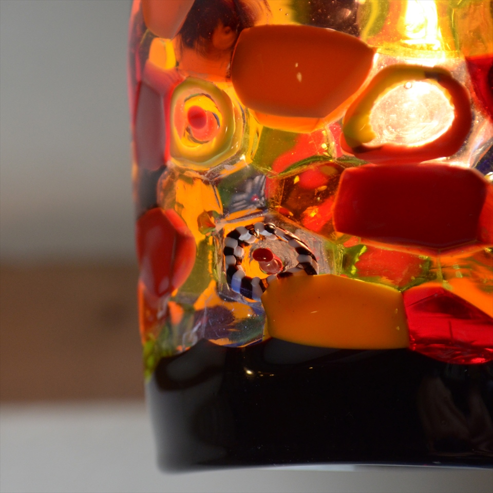 ランプにちりばめられたドット模様は、ベネチアンガラスの伝統的な技法、ミルフィオリと呼ばれるガラスを用いたものです。金太郎飴のように模様の入ったガラス棒を短くカットし、断面を見せることでこのような模様を作り出すことができます。