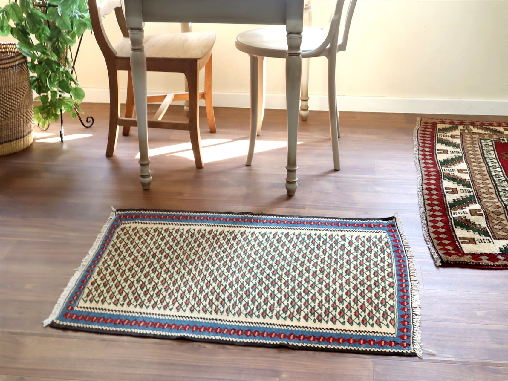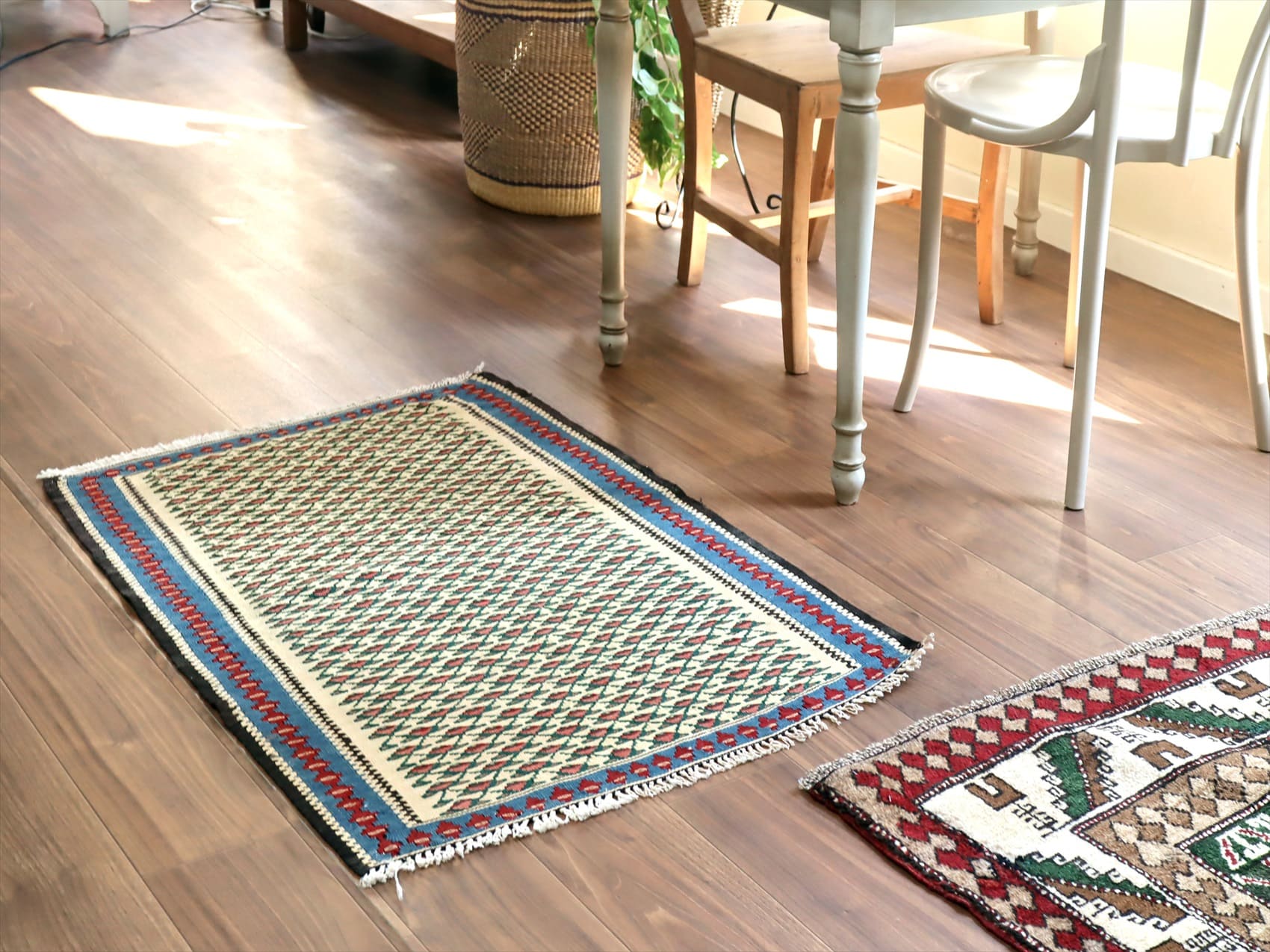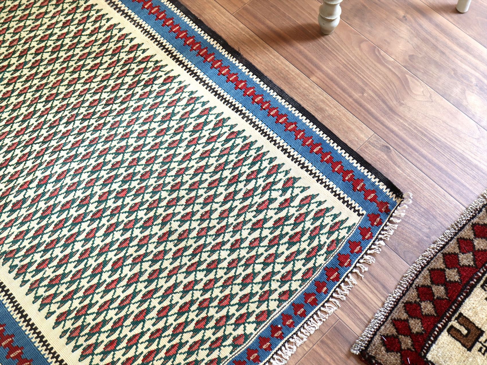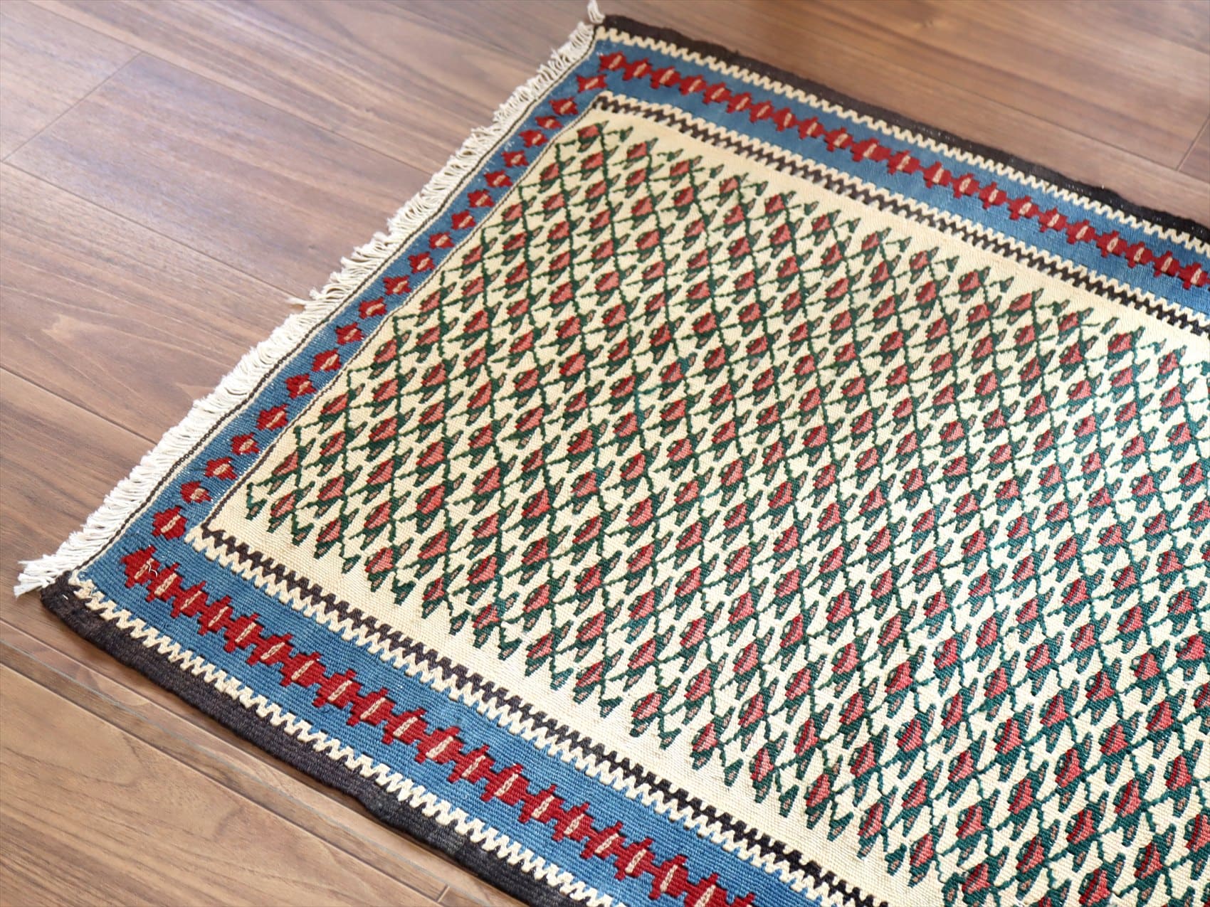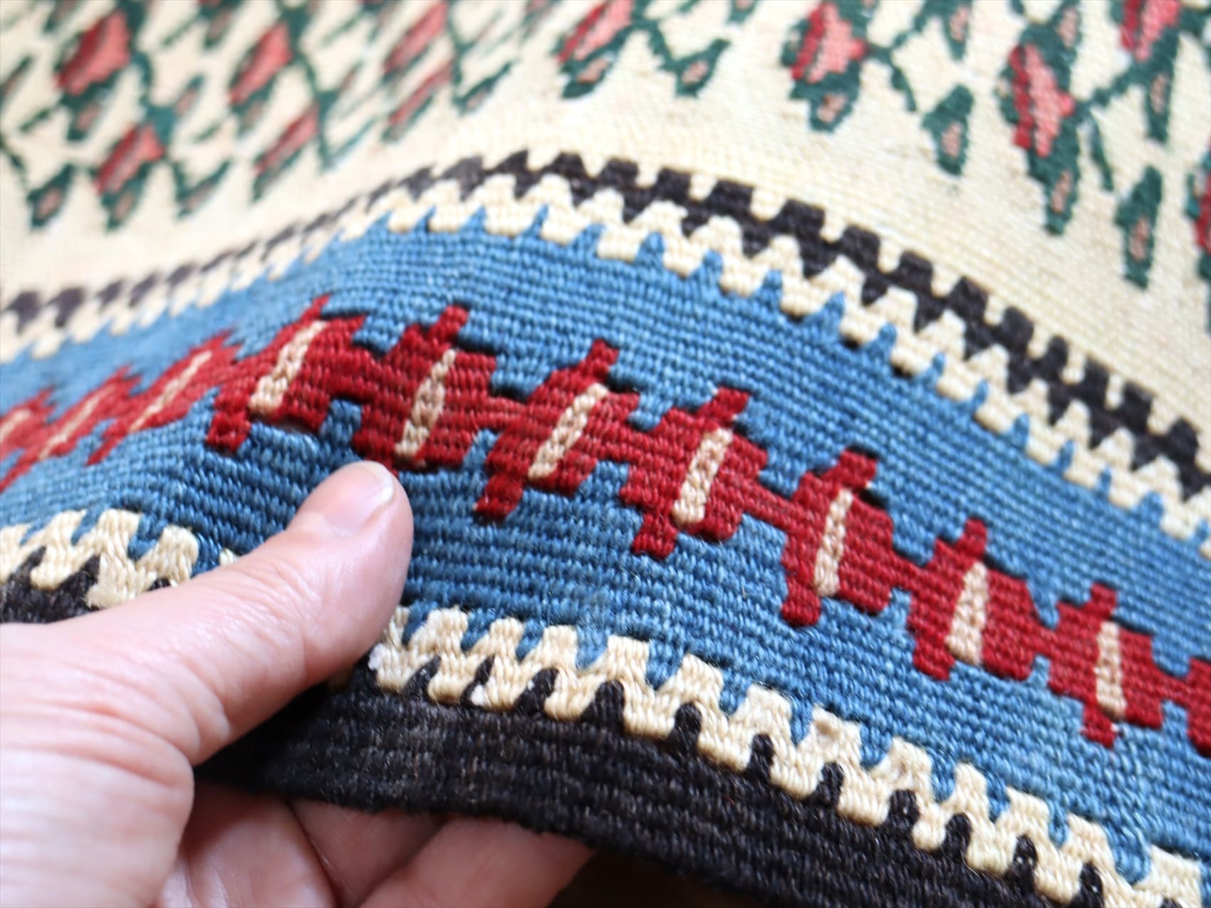 目がぎゅっと詰まって、しっかりとした厚みのあるキリム。(7mm前後の厚み)輸出向けに織られたキリムが数年経って出てきたもので、きれいな状態です。