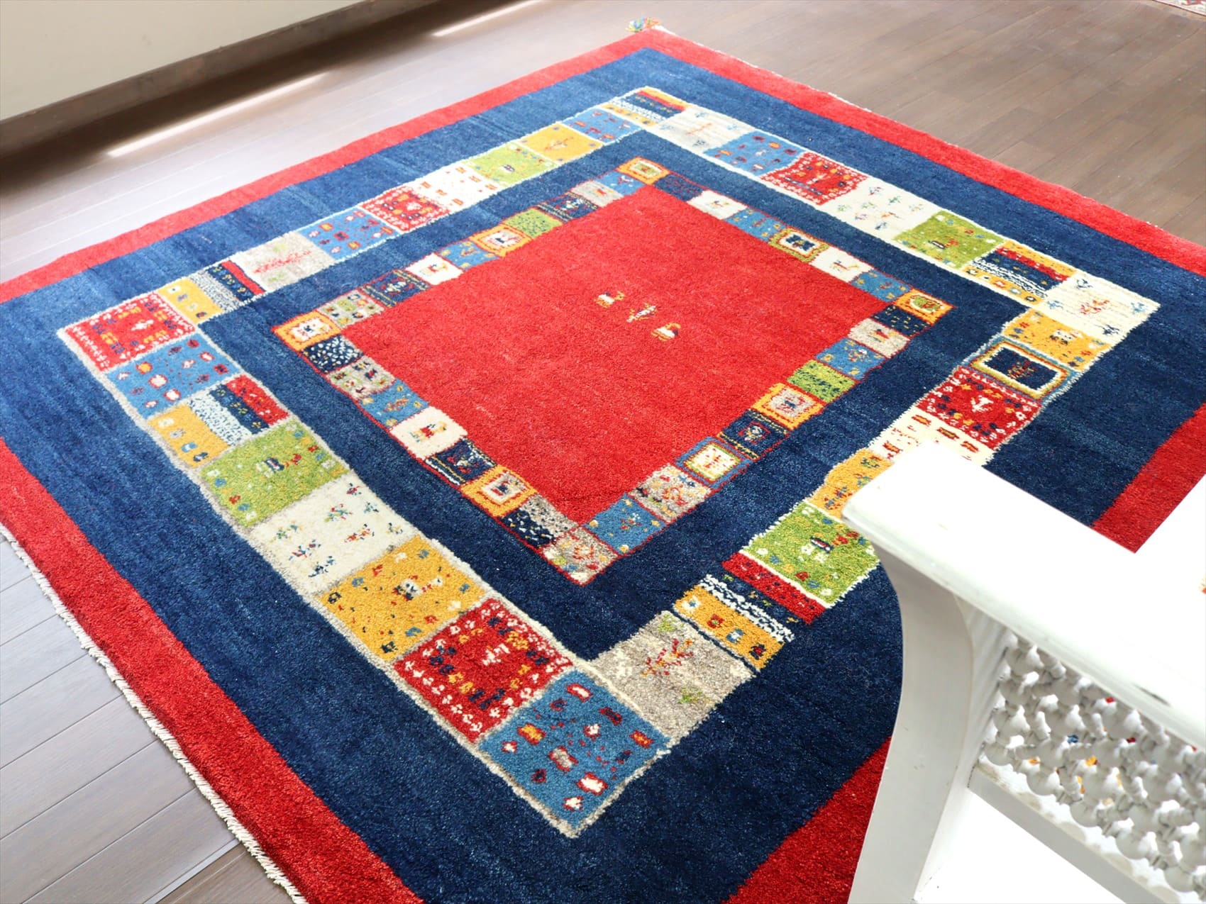 - ギャッベ レッド&ネイビー190×180cm 正方形 リビングサイズ カラフルタイル