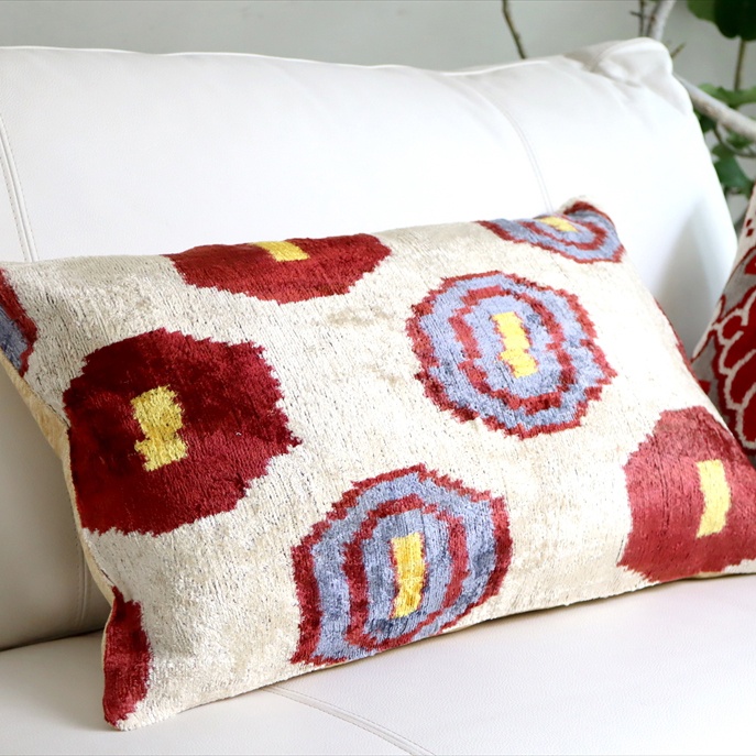 - ウズベキスタン・アトラス(イカット・絣) クッション 横長クッションカバー・ピローケース シルクベルベット 59×38cm 赤い水玉/裏面の色はアイボリー