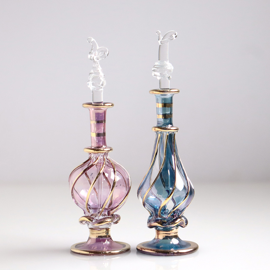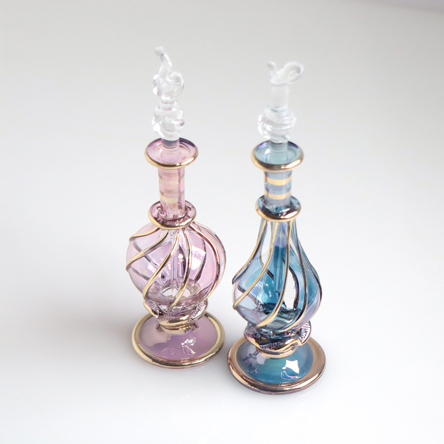 5. エジプト ガラス香水瓶 11cm 2本セット ゴールドライン ファラオ ユニークなボトルキャップ
