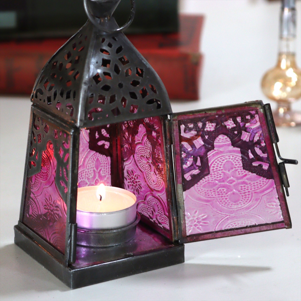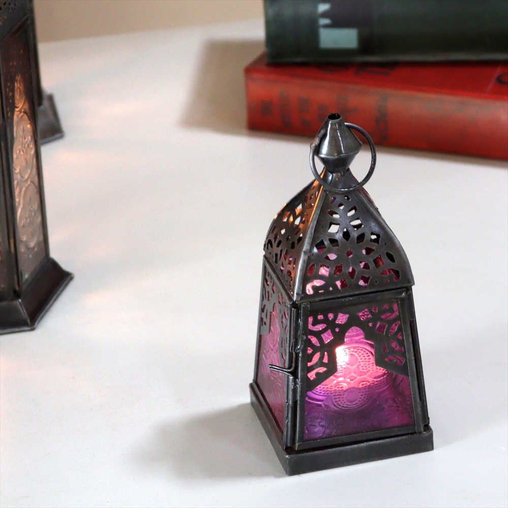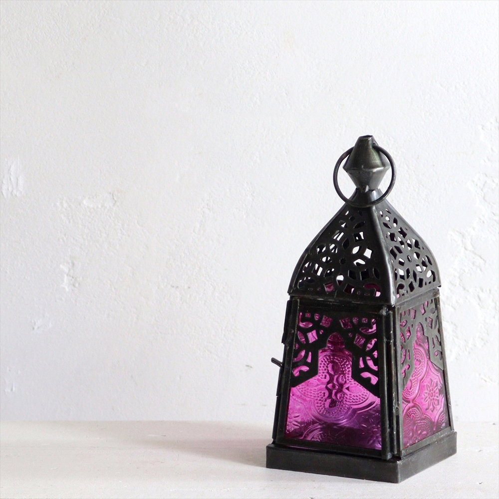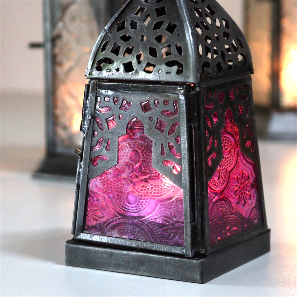 4面のレリーフガラスがはられた小ぶりなランタン。ミフラープ(お祈りの方向を示すくぼみ)がデザインされています。ビビットなピンクはモノトーンの家具や空間と相性がよくお部屋のアクセントになってくれそうです。とても小ぶりなサイズなので違う種類や同じものを窓際やテーブルの上に並べるだけで素敵でモロッカンスタイルな雰囲気のお部屋になります。