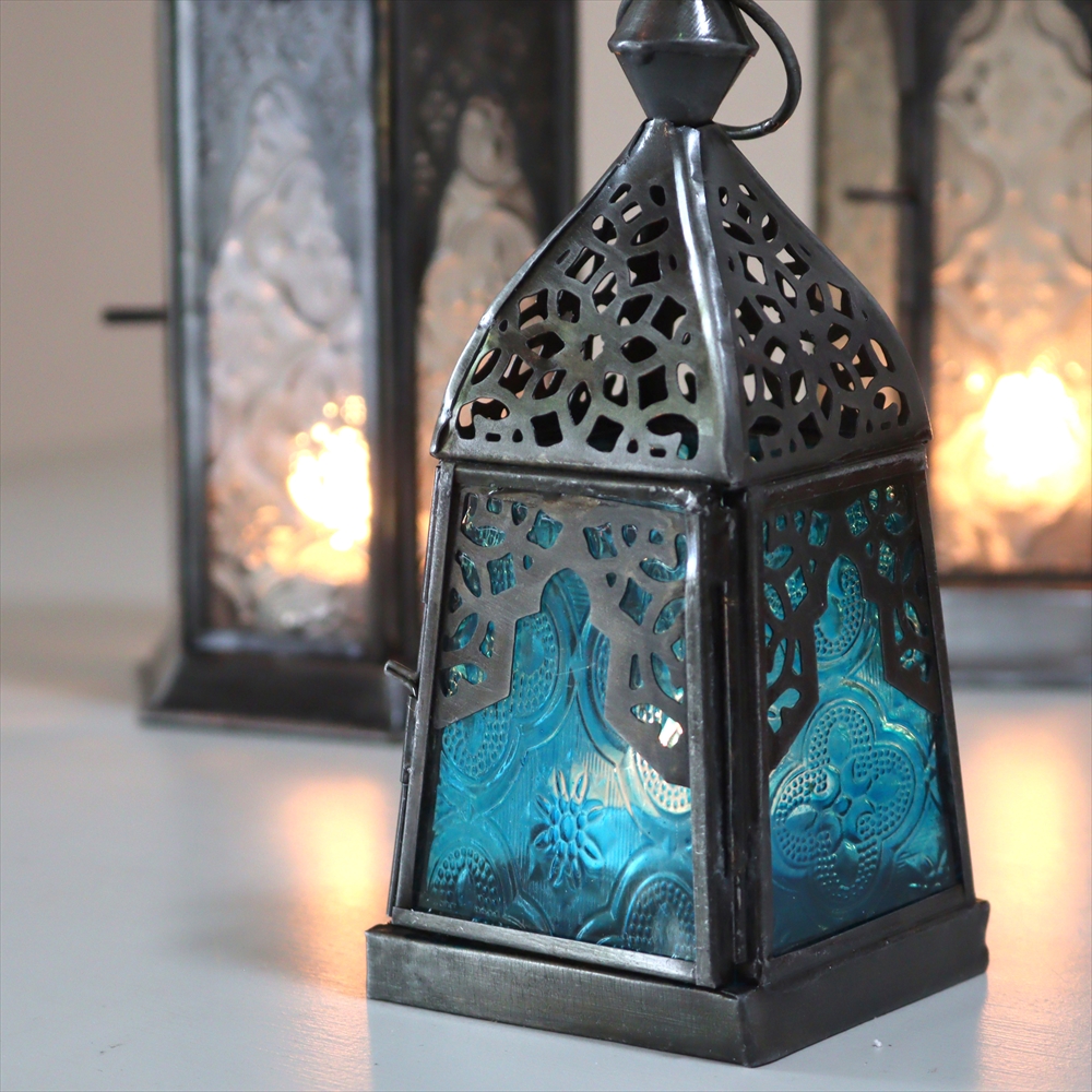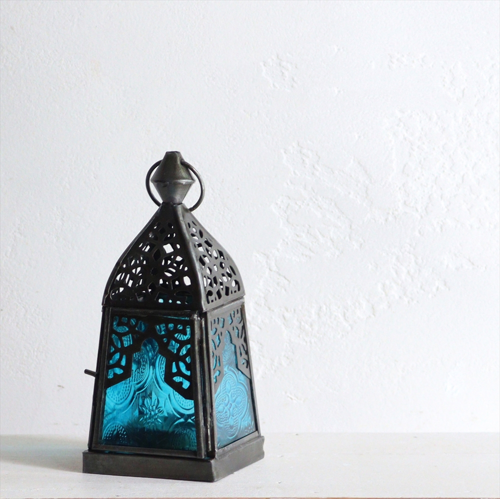 4面のレリーフガラスがはられた小ぶりなランタン。ミフラープ(お祈りの方向を示すくぼみ)がデザインされています。南国の海を思わせるような透き通ったターコイズブルーは白基調のお部屋や茶系の家具と相性がよさそうです。とても小ぶりなサイズなので違う種類や同じものを窓際やテーブルの上に並べるだけで素敵でモロッカンスタイルな雰囲気のお部屋になります。