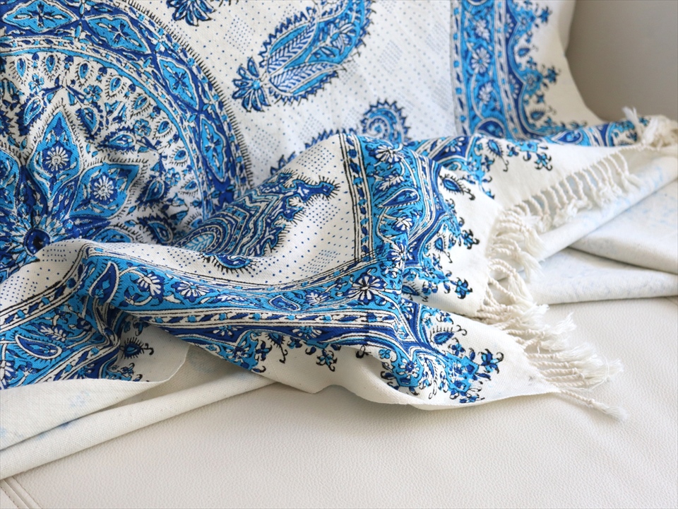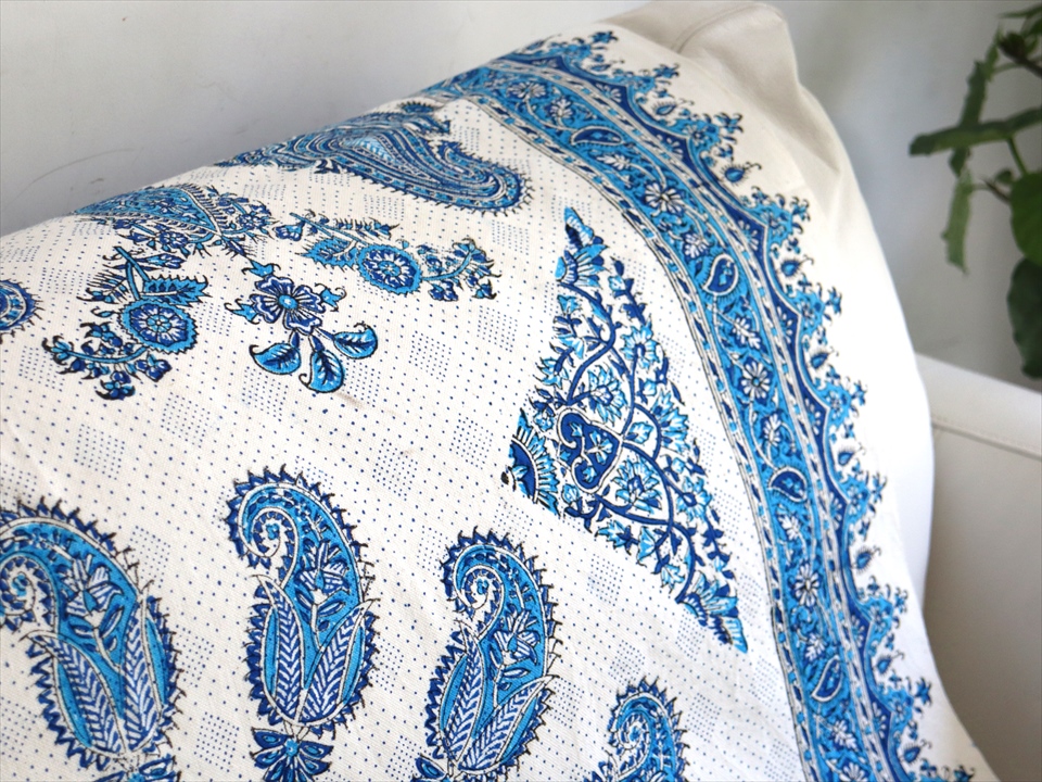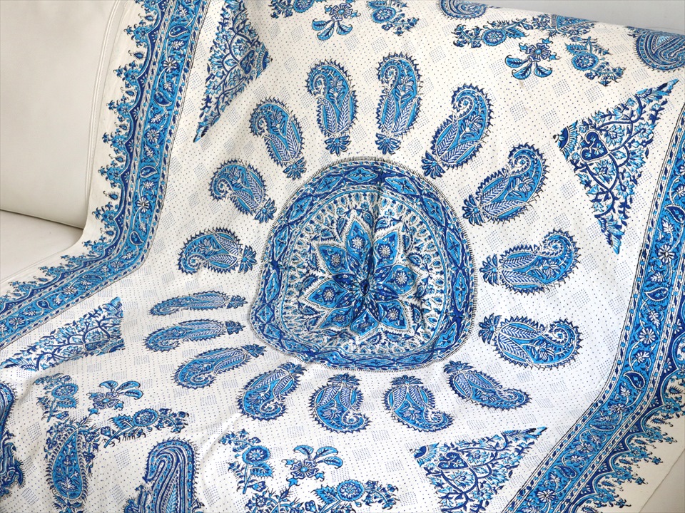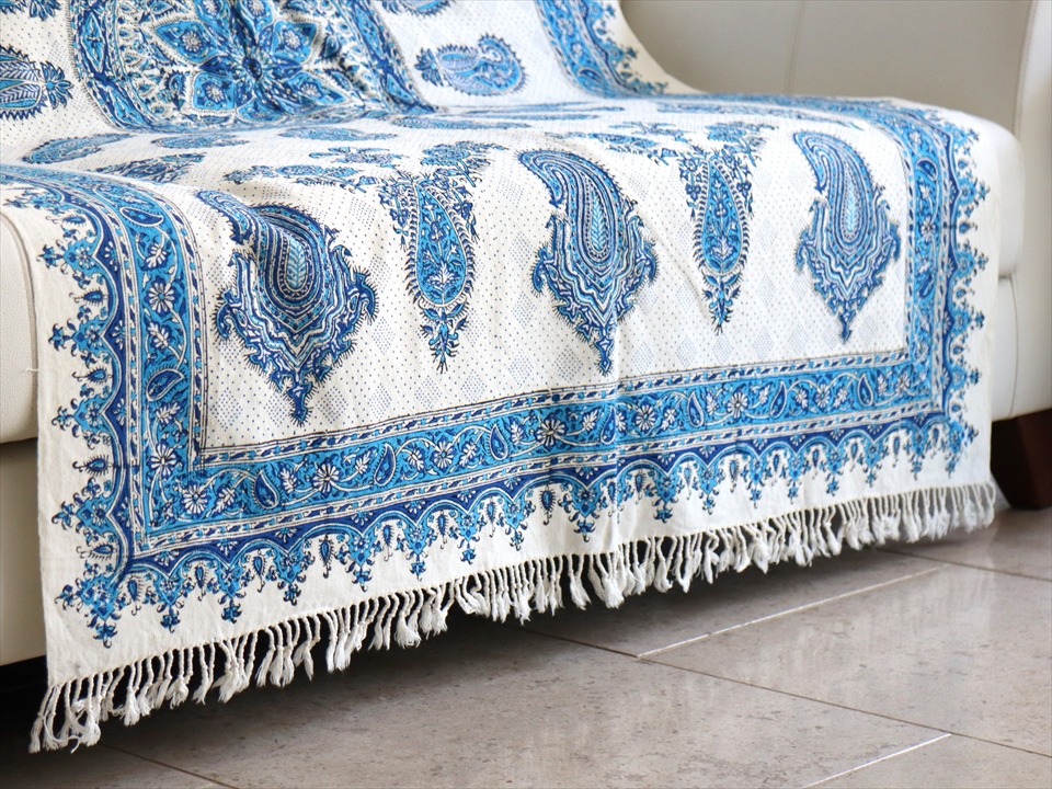 ペルシャ更紗・イラン手染め布/150x100cmサイズ ソファカバー・テーブルクロス ブルー系ペイズリー柄