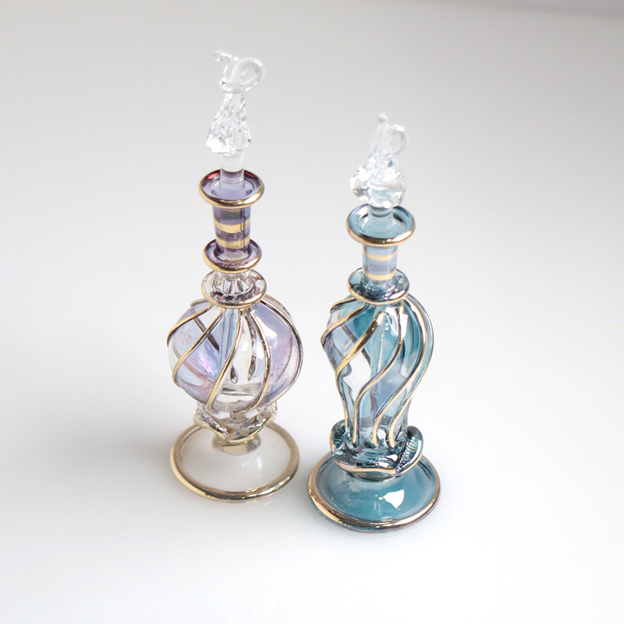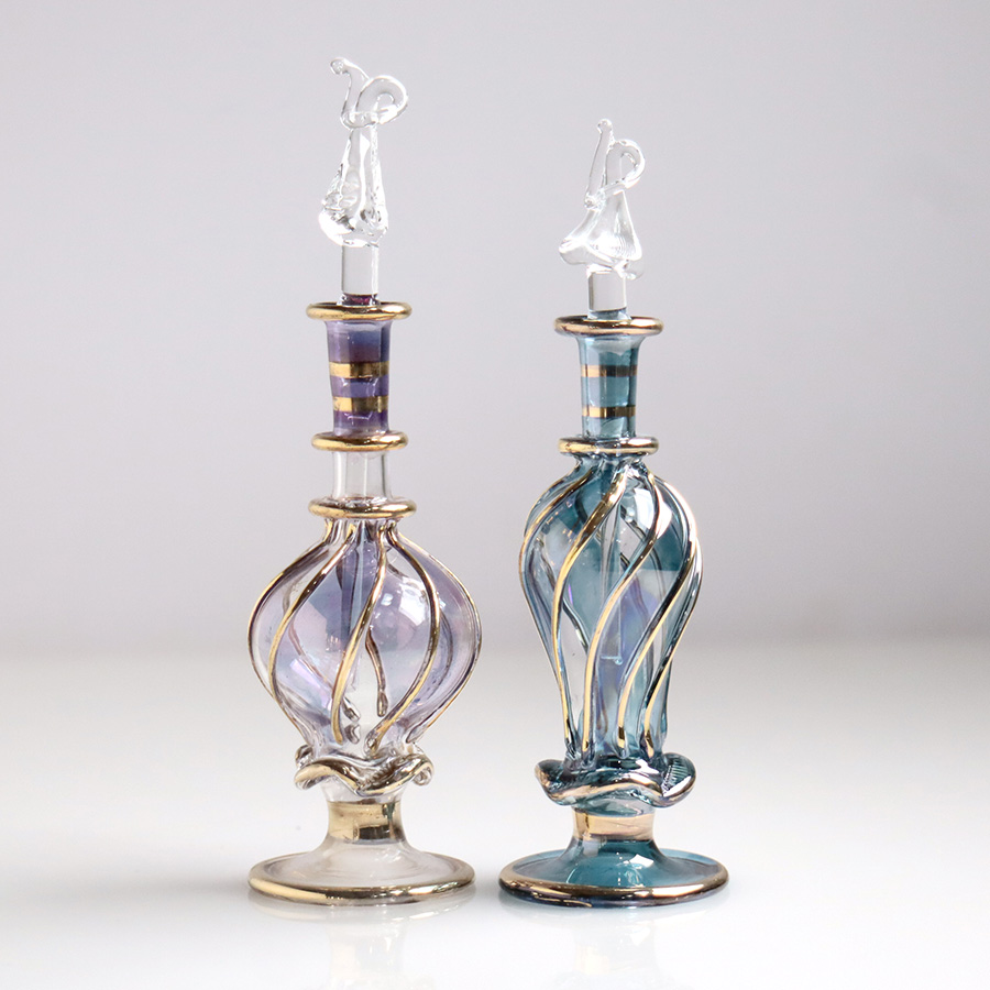 5. エジプト ガラス香水瓶 11cm 2本セット ゴールドライン ファラオ ユニークなボトルキャップ
