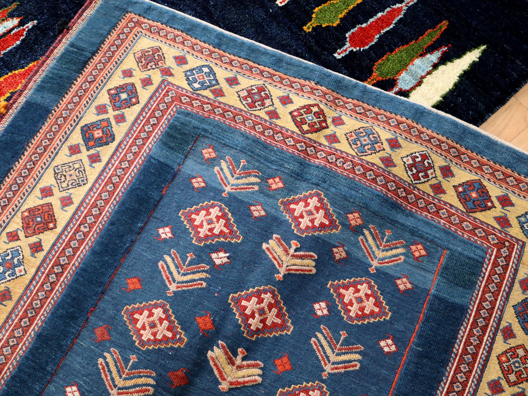 ほぼ正方形に近いサイズで織られたバルーチスマック。センターにはダイヤのかたちをした幾何学モチーフと生命の樹が織られ、イエローのボーダー部分にはトルコキリムにもよく登場する狼の足跡を思わせるようなデザインが描かれています。ブルーの枠の部分がカーペット織りになっています。