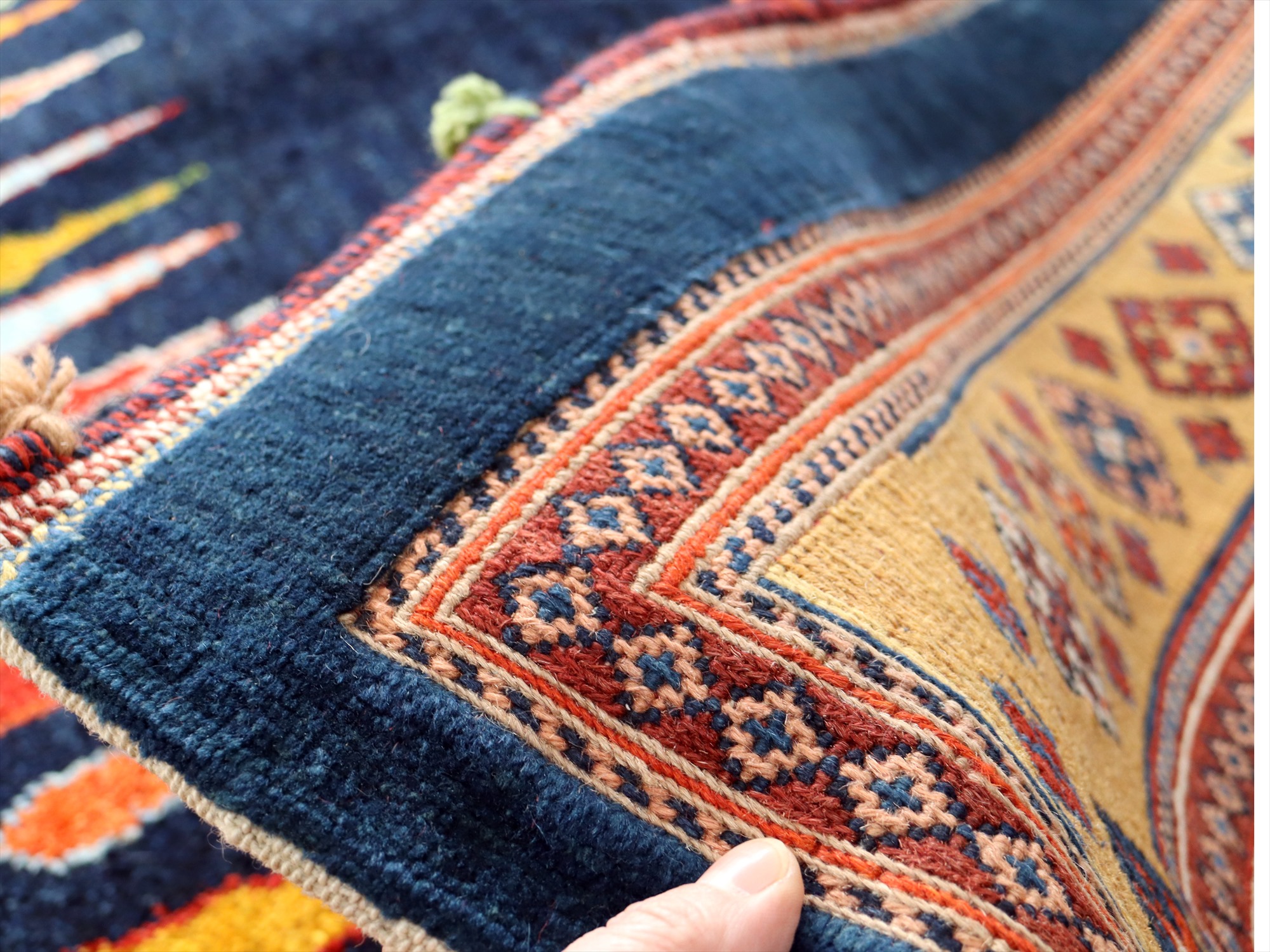 ベースの部分は厚みがあり、しっかりとしたハリがあるスマック織りのキリムです。カーペット織りの部分はパイル(毛足)のある織りで、表面は立体感があります。