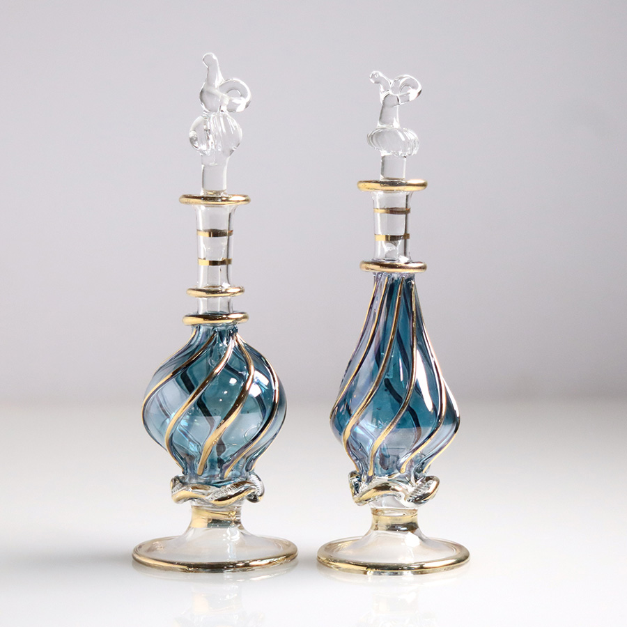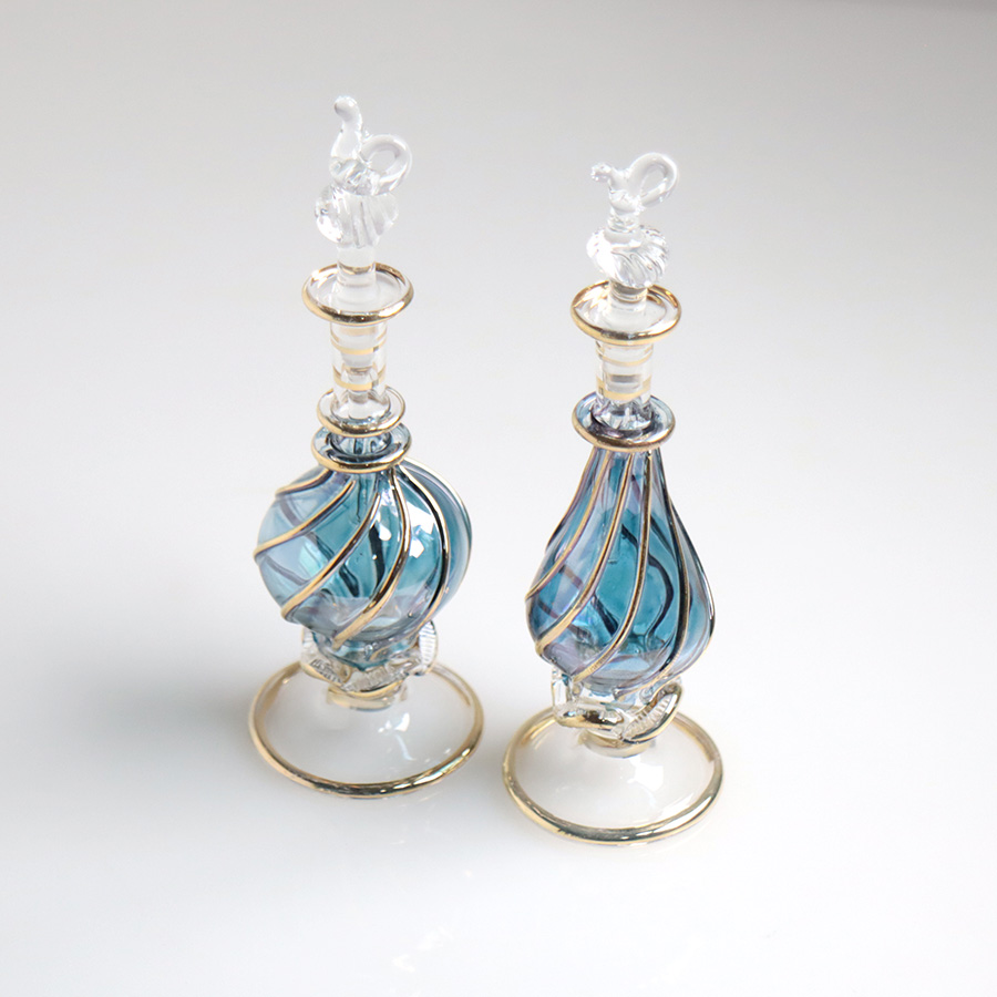5. エジプト ガラス香水瓶 11cm 2本セット ゴールドライン ファラオ ユニークなボトルキャップ