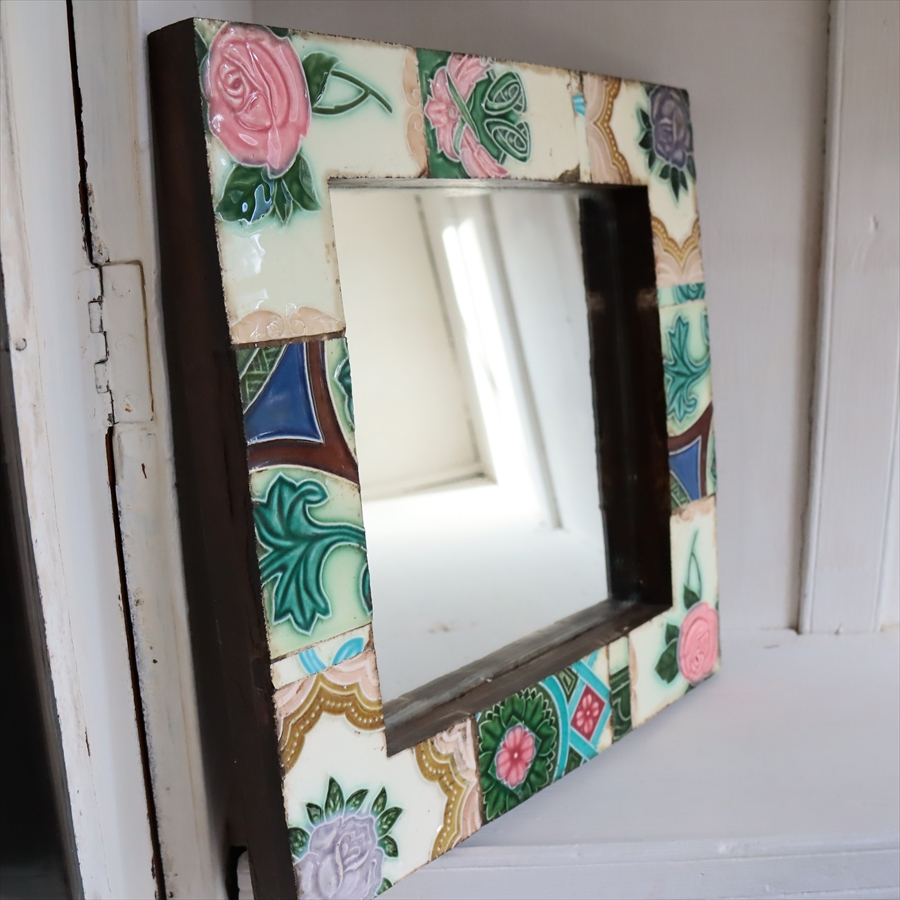 インドのアンティークショップで発見された、大正末期から昭和初期に日本で作られたマジョリカタイル。 貴重なタイルを使用して壁掛けミラーに生まれ変わりました。裏側には壁掛け用の穴が空いています。古き良きアンティークの雰囲気をお楽しみください。ミラー部分の大きさ20.5×20.5cm。