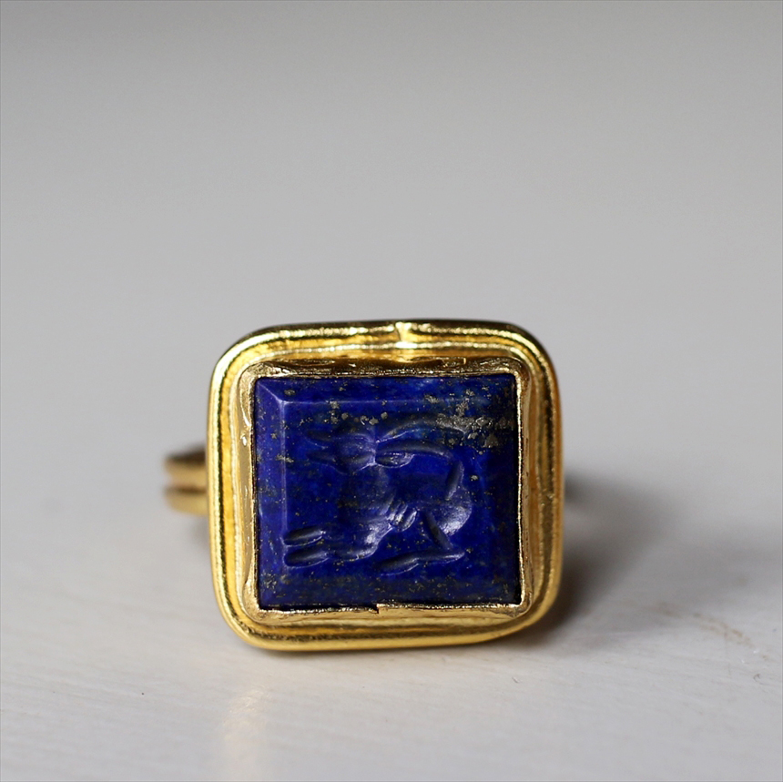 深いブルーの天然石(ラピスラズリ)に、山羊のような動物モチーフを沈み彫した、トルコ製のインタリオリングです。クラシカルな雰囲気の存在感のある一点です。