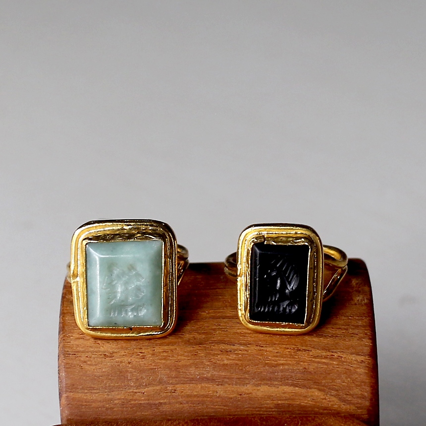 古代印章を思わせる鳥の彫刻モチーフが、天然石に沈み彫り(インタリオ)されたリングです。クラシカルで知的な雰囲気が魅力です。