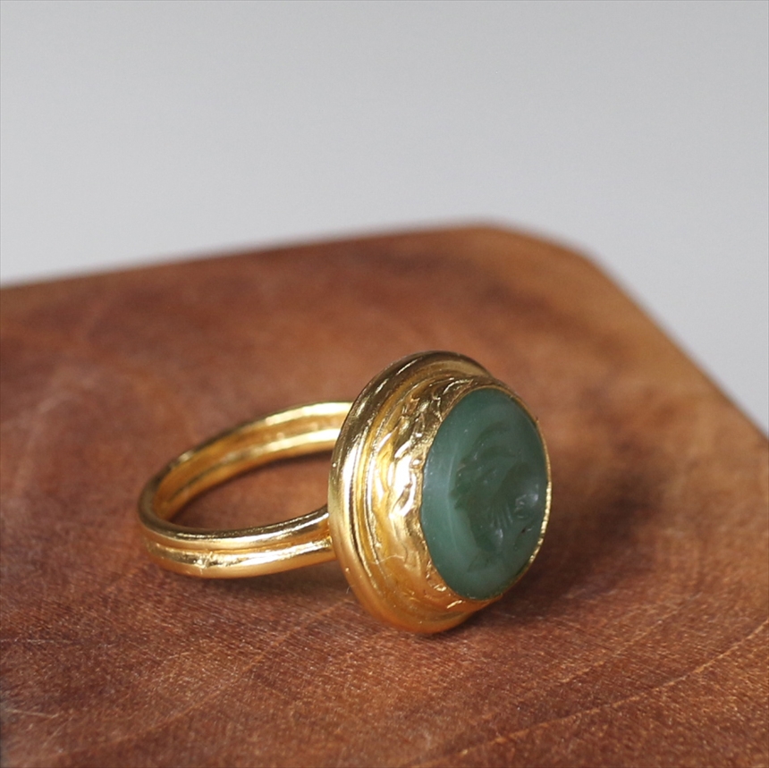 アルサメイア インタリオリング ラウンド グリーンジェイド 天然石22Kゴールドプレーテッド トルコジュエリー