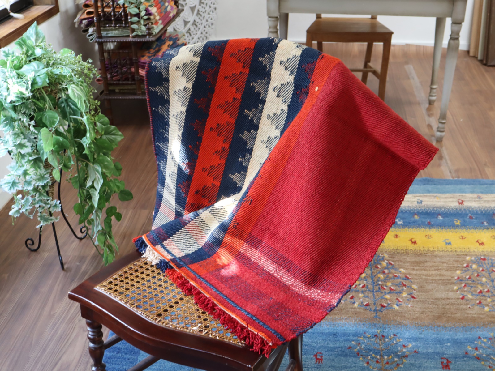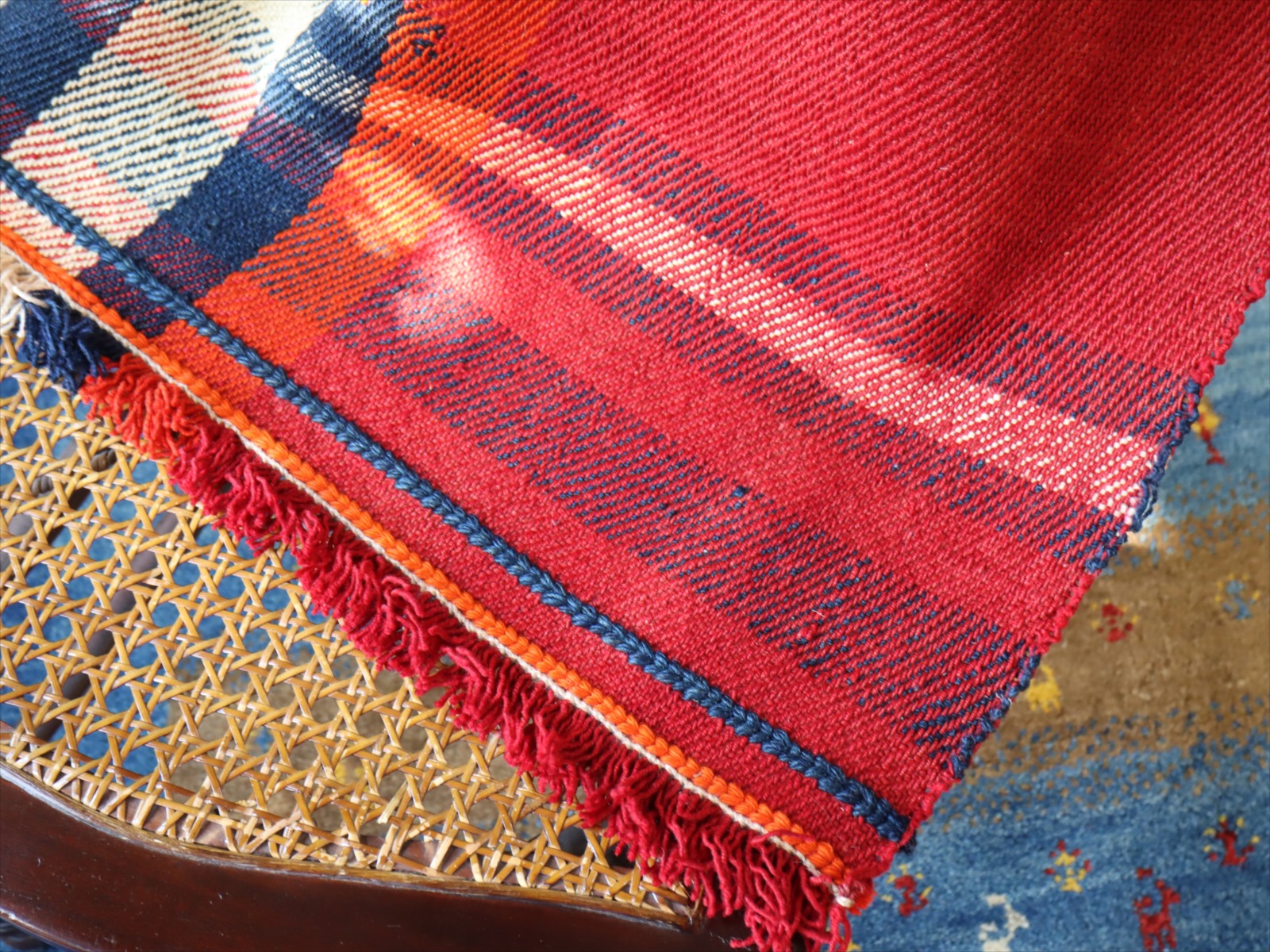 カシュカイ族の織るキリムは一般的にトルコキリムより厚みがありがっちりとした質感です。織り地は厚みがあり、ぎゅっと目が詰まって、固くしっかりとしています。