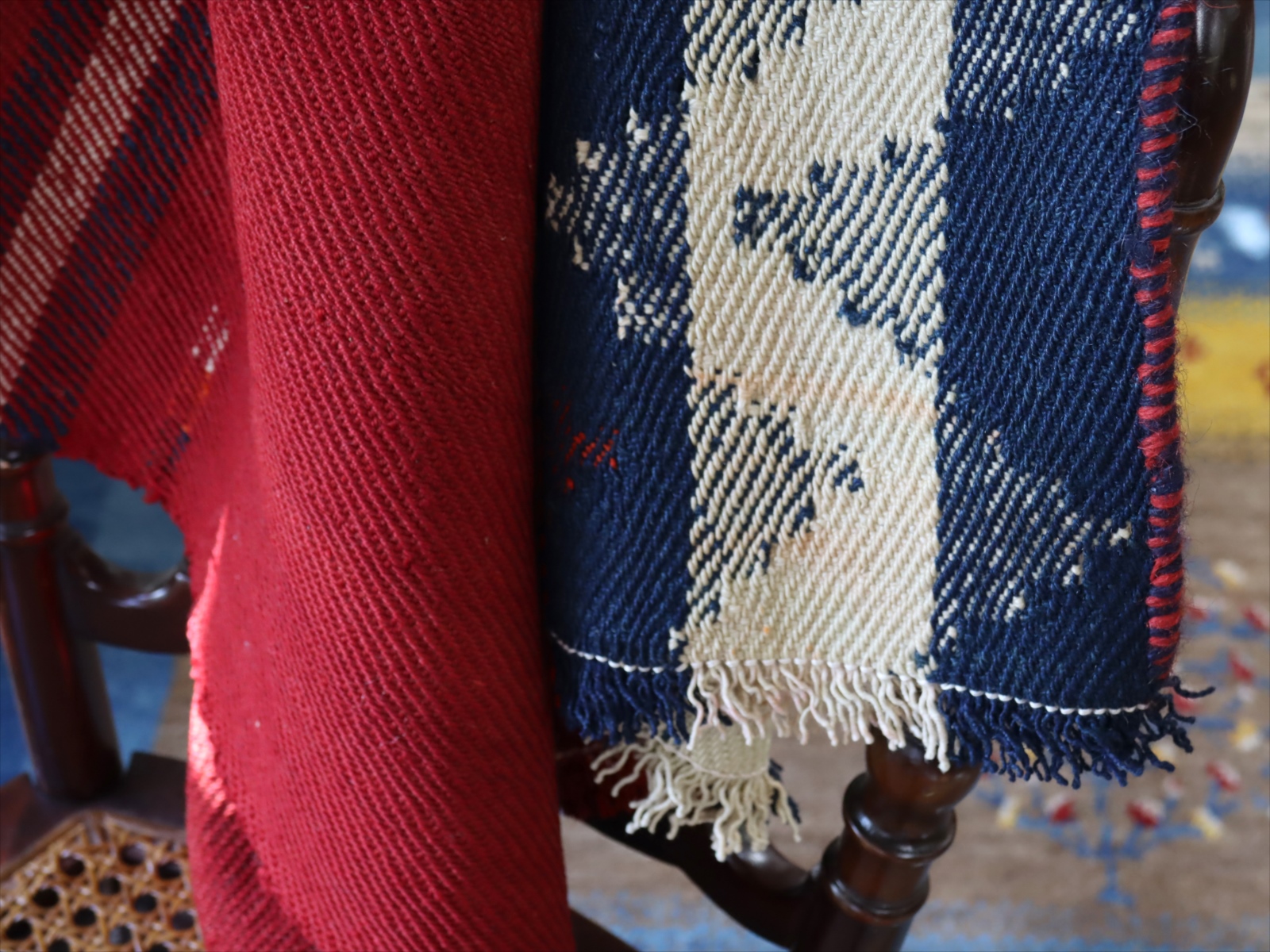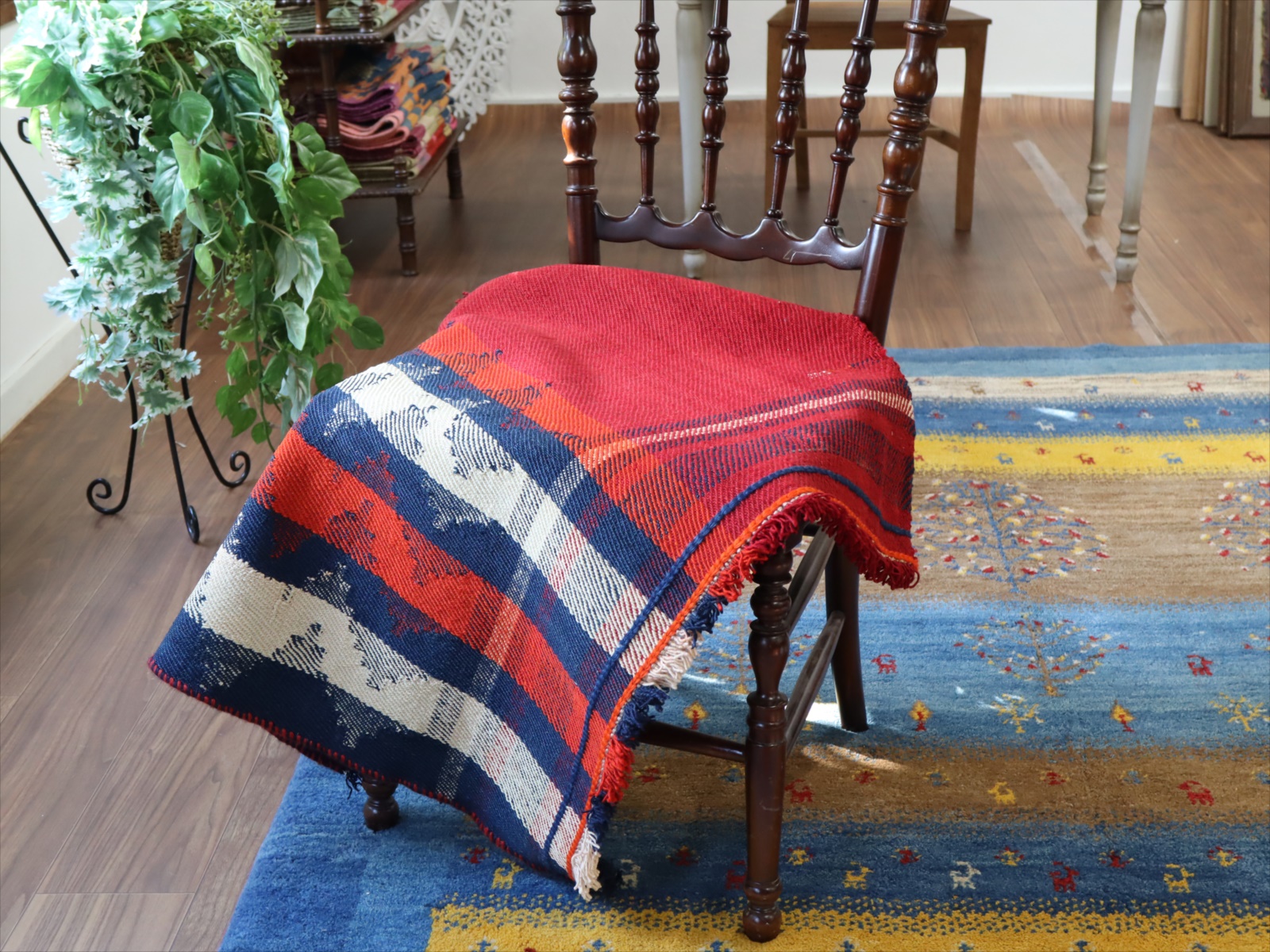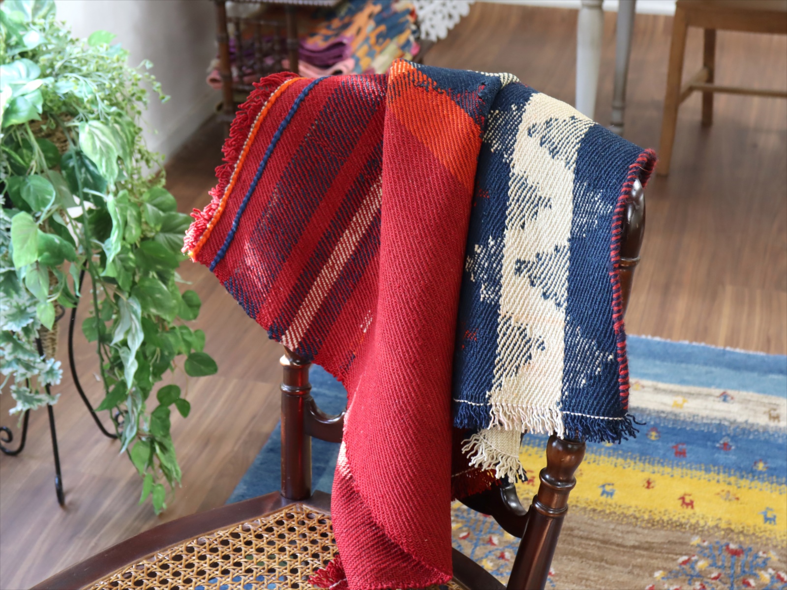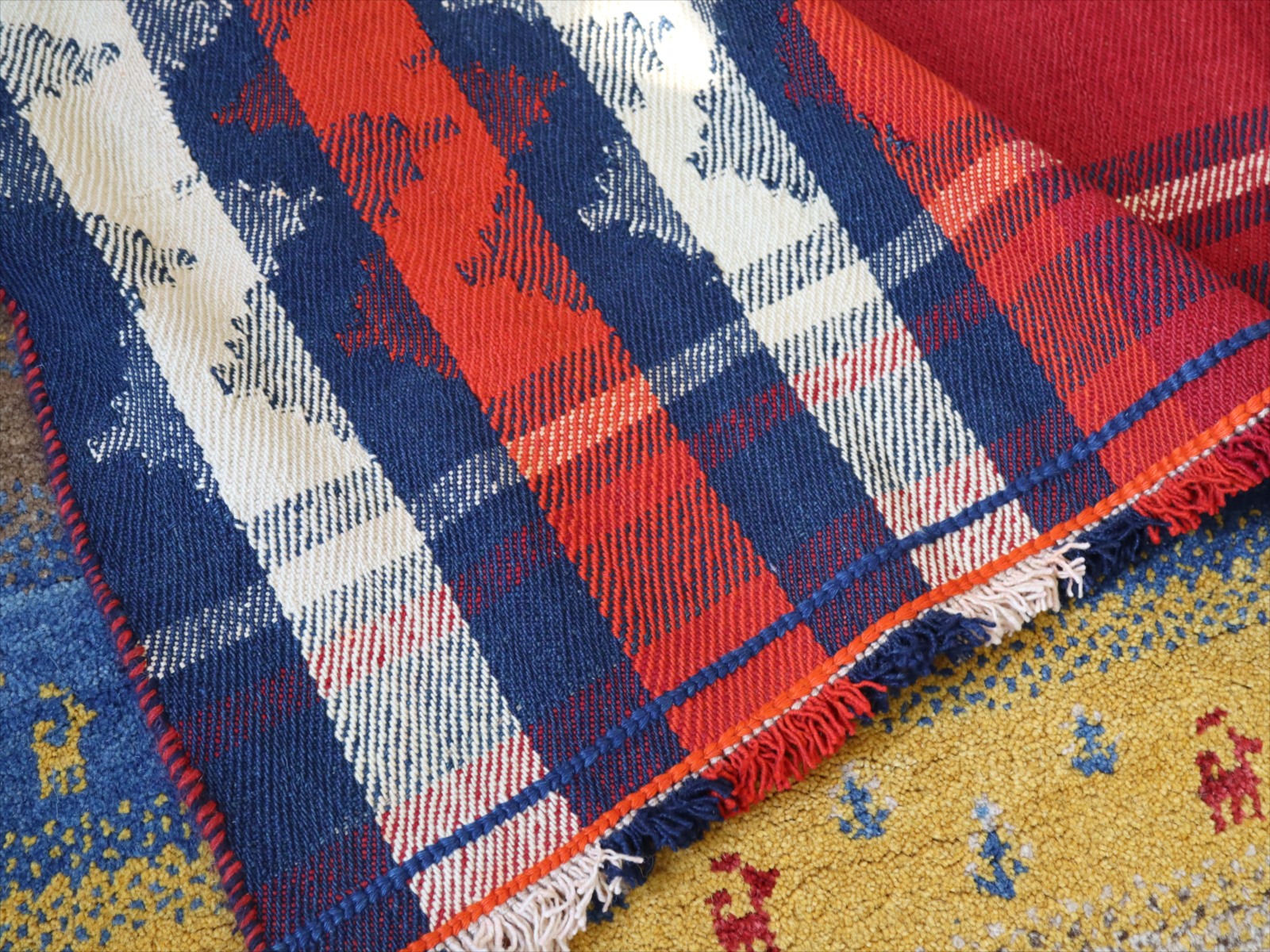 カシュカイ族の織るキリムは一般的にトルコキリムより厚みがありがっちりとした質感です。織り地は厚みがあり、ぎゅっと目が詰まって、固くしっかりとしています。