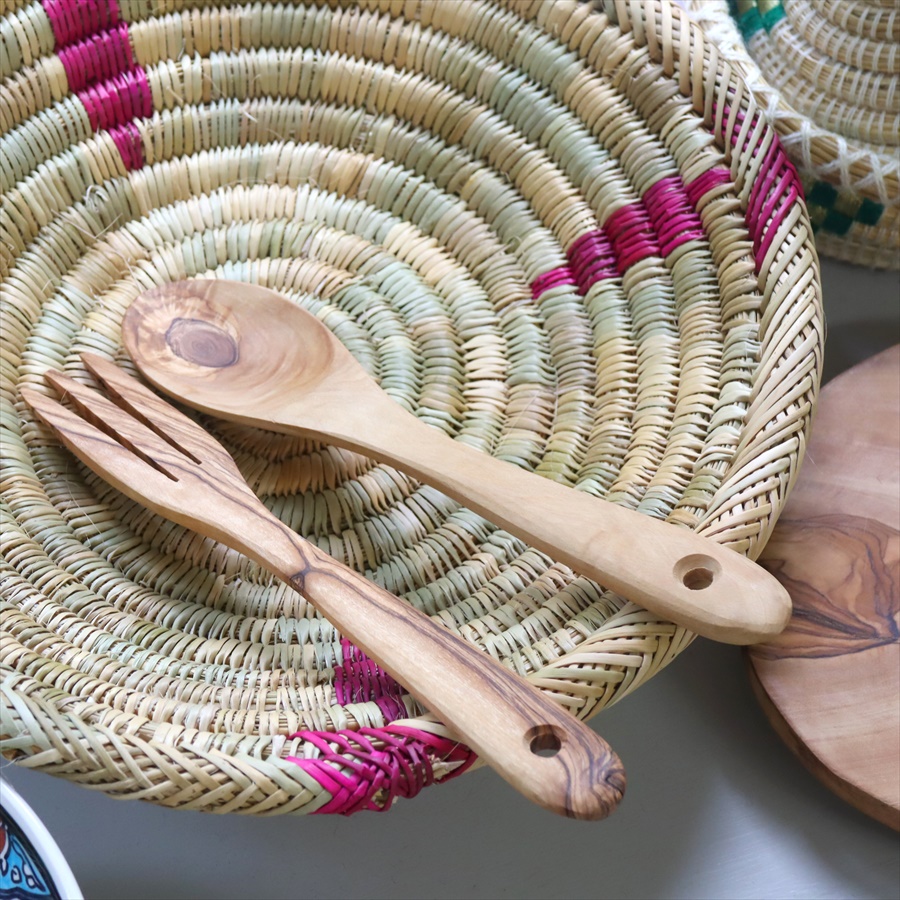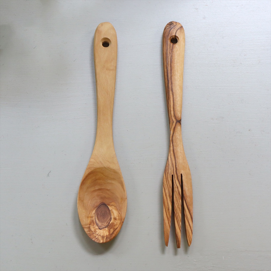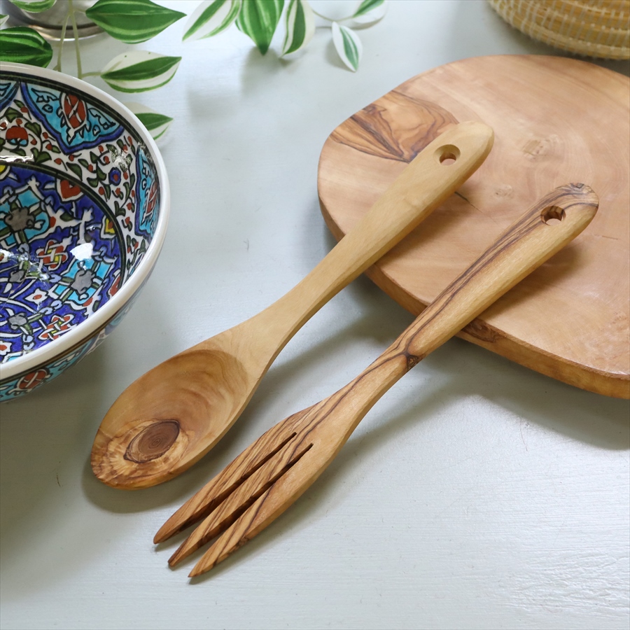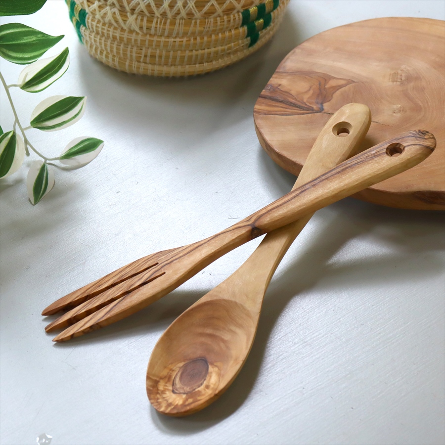チュニジアの職人が丹精込めて作った、世界にひとつだけの味わいあるキッチングッズ。サラダスプーンとフォークです。オリーブの木のナチュラルな風合いが魅力。そのままテーブルに出してつかえます。